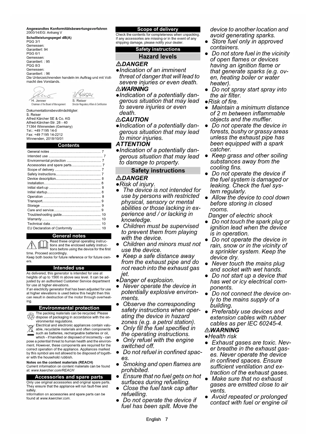 • -Emissionen gemäß dem Messverfahren der EU-Verordnung 2016/1628 Euro V Motor g/kWh 790 678 678English 7 Angewandtes Konformitätsbewertungsverfahren 2000/14/EG: Anhang V Schallleistungspegel dB(A) PGG 3/1 Gemessen: Garantiert: 94 PGG 6/1 Gemessen: Garantiert: : 95 PGG 8/3 Gemessen: Garantiert: : 96 Die Unterzeichnenden handeln im Auftrag und mit Voll- macht des Vorstands. Dokumentationsbevollmächtigter: S. Reiser Alfred Kärcher SE & Co. KG Alfred-Kärcher-Str. 28 - 40 71364 Winnenden (Germany) Tel.: +49 7195 14-0 Fax: +49 7195 14-2212 Winnenden, 2018/10/01 Contents General notes Read these original operating instruc- tions and the enclosed safety instruc- tions before using the device for the first time. Proceed accordingly. Keep both books for future reference or for future own- ers. Intended use As delivered, this generator is intended for use at heights of up to 1500 m above sea level. It can be ad- justed by an authorised Customer Service department for use at higher elevations. If an electricity generator that has been adjusted for use at higher elevations is used below this height then this can result in destruction of the motor through overheat- ing. Environmental protection The packing materials can be recycled. Please dispose of packaging in accordance with the en- vironmental regulations. Electrical and electronic appliances contain valu- able, recyclable materials and often components such as batteries, rechargeable batteries or oil, which - if handled or disposed of incorrectly - can pose a potential threat to human health and the environ- ment. However, these components are required for the correct operation of the appliance. Appliances marked by this symbol are not allowed to be disposed of togeth- er with the household rubbish. Notes on the content materials (REACH) Current information on content materials can be found at: www.kaercher.com/REACH Accessories and spare parts Only use original accessories and original spare parts. They ensure that the appliance will run fault-free and safely. Information on accessories and spare parts can be found at www.kaercher.com. Scope of delivery Check the contents for completeness when unpacking. If any accessories are missing or in the event of any shipping damage, please notify your dealer. Safety instructions Hazard levels DANGER ●Indication of an imminent threat of danger that will lead to severe injuries or even death. 몇 WARNING ●Indication of a potentially dan- gerous situation that may lead to severe injuries or even death. 몇 CAUTION ●Indication of a potentially dan- gerous situation that may lead to minor injuries. ATTENTION ●Indication of a potentially dan- gerous situation that may lead to damage to property. Safety instructions DANGER ●Risk of injury. ● The device is not intended for use by persons with restricted physical, sensory or mental abilities or those lacking in ex- perience and / or lacking in knowledge. ● Children must be supervised to prevent them from playing with the device. ● Children and minors must not use the device. ● Keep a safe distance away from the exhaust pipe and do not reach into the exhaust gas jet. ●Danger of explosion. ● Never operate the device in potentially explosive environ- ments. ● Observe the corresponding safety instructions when oper- ating the device in hazard zones (e.g. a petrol station). ● Only fill the fuel specified in the operating instructions. ● Only refuel with the engine switched off. ● Do not refuel in confined spac- es. ● Smoking and open flames are prohibited. ● Ensure that no fuel gets on hot surfaces during refuelling. ● Close the fuel tank cap after refuelling. ● Do not operate the device if fuel has been spilt. Move the device to another location and avoid generating sparks. ● Store fuel only in approved containers. ● Do not store fuel in the vicinity of open flames or devices having an ignition flame or that generate sparks (e.g. ov- en, heating boiler or water heater). ● Do not spray start spray into the air filter. ●Risk of fire. ● Maintain a minimum distance of 2 m between inflammable objects and the muffler. ● Do not operate the device in forests, bushy or grassy areas unless the exhaust pipe has been equipped with a spark catcher. ● Keep grass and other soiling substances away from the cooling fins. ● Do not operate the device if the fuel system is damaged or leaking. Check the fuel sys- tem regularly. ● Allow the device to cool down before storing in closed rooms. Danger of electric shock ● Do not touch the spark plug or ignition lead when the device is in operation. ● Do not operate the device in rain, snow or in the vicinity of a sprinkler system. Keep the device dry. ● Never touch the mains plug and socket with wet hands. ● Do not start up a device that has wet or icy electrical com- ponents. ● Do not connect the device on- ly to the mains supply of a building. ● Preferably use devices and extension cables with rubber cables as per IEC 60245-4. 몇 WARNING ●Health risk ● Exhaust gases are toxic. Nev- er breathe in the exhaust gas- es. Never operate the device in confined spaces. Ensure sufficient ventilation and ex- traction of the exhaust gases. ● Make sure that no exhaust gases are emitted close to air vents. ● Avoid repeated or prolonged contact with fuel or engine oil General notes p. 7
