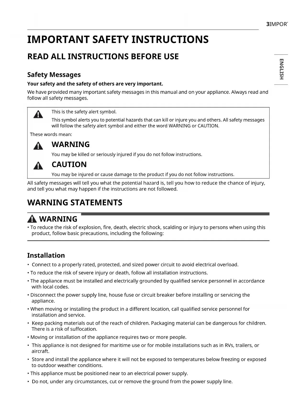 Safety Messages Your safety and the safety of others are very important. We have provided many important safety messages in this manual and on your appliance. Always read and follow all safety messages.All safety messages will tell you what the potential hazard is, tell you how to reduce the chance of injury, and tell you what may happen if the instructions are not followed. WARNING STATEMENTS WARNING