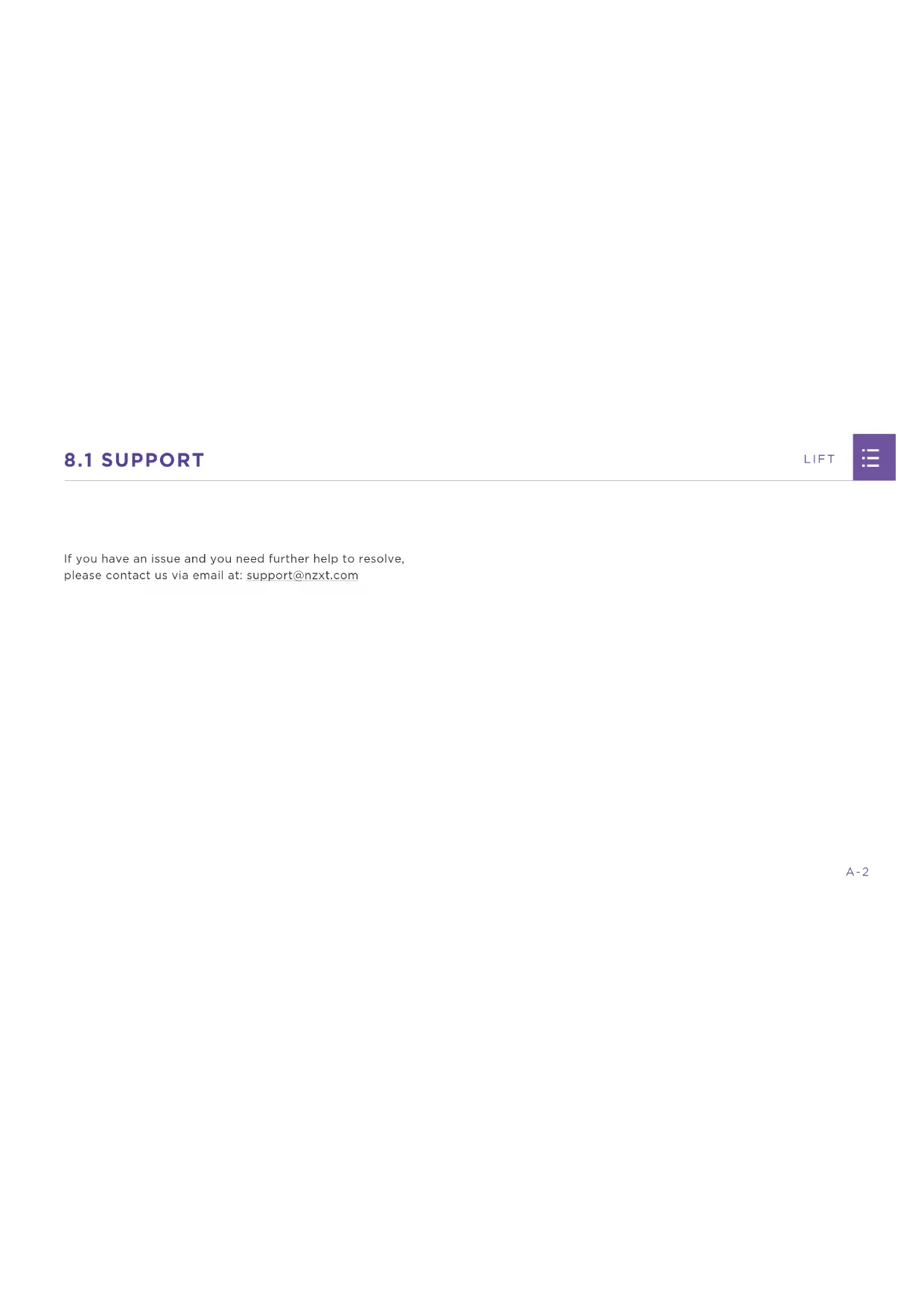 If you have an issue and you need further help to resolve, please contact us via email at: support@nzxt.comA-3 LIFT