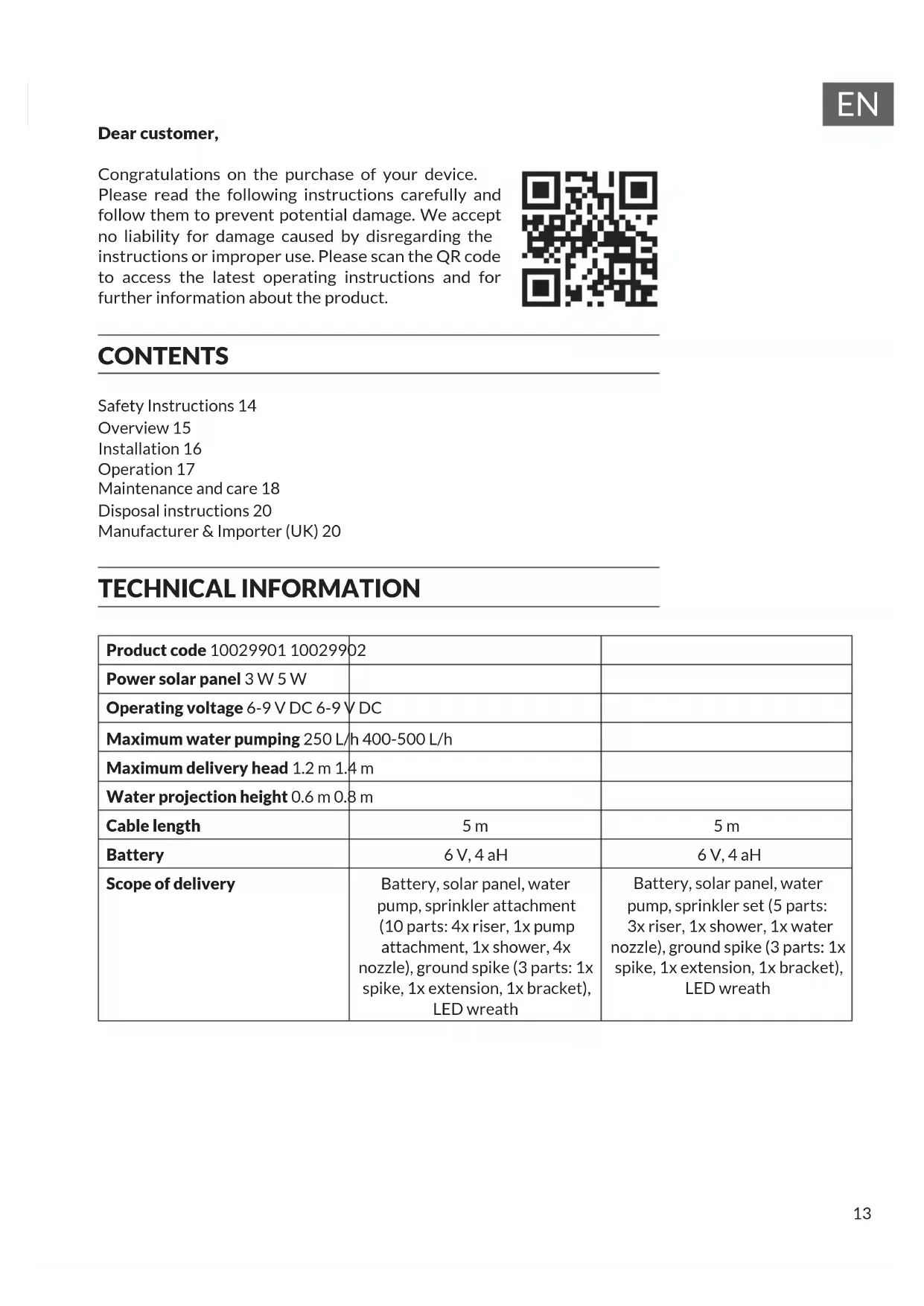 Dear customer, Congratulations on the purchase of your device. Please read the following instructions carefully and follow them to prevent potential damage. We accept no liability for damage caused by disregarding the instructions or improper use. Please scan the QR code to access the latest operating instructions and for further information about the product. CONTENTS Safety Instructions 14 Overview 15 Installation 16 Operation 17 Maintenance and care 18 Disposal instructions 20 Manufacturer & Importer (UK) 20 TECHNICAL INFORMATION Product code 10029901 10029902 Power solar panel 3 W 5 W Operating voltage 6-9 V DC 6-9 V DC Maximum water pumping 250 L/h 400-500 L/h Maximum delivery head 1.2 m 1.4 m Water projection height 0.6 m 0.8 m Cable length 5 m 5 m Battery 6 V, 4 aH 6 V, 4 aH Scope of delivery Battery, solar panel, water pump, sprinkler attachment (10 parts: 4x riser, 1x pump attachment, 1x shower, 4x nozzle), ground spike (3 parts: 1x spike, 1x extension, 1x bracket), LED wreath Battery, solar panel, water pump, sprinkler set (5 parts: 3x riser, 1x shower, 1x water nozzle), ground spike (3 parts: 1x spike, 1x extension, 1x bracket), LED wreath14
