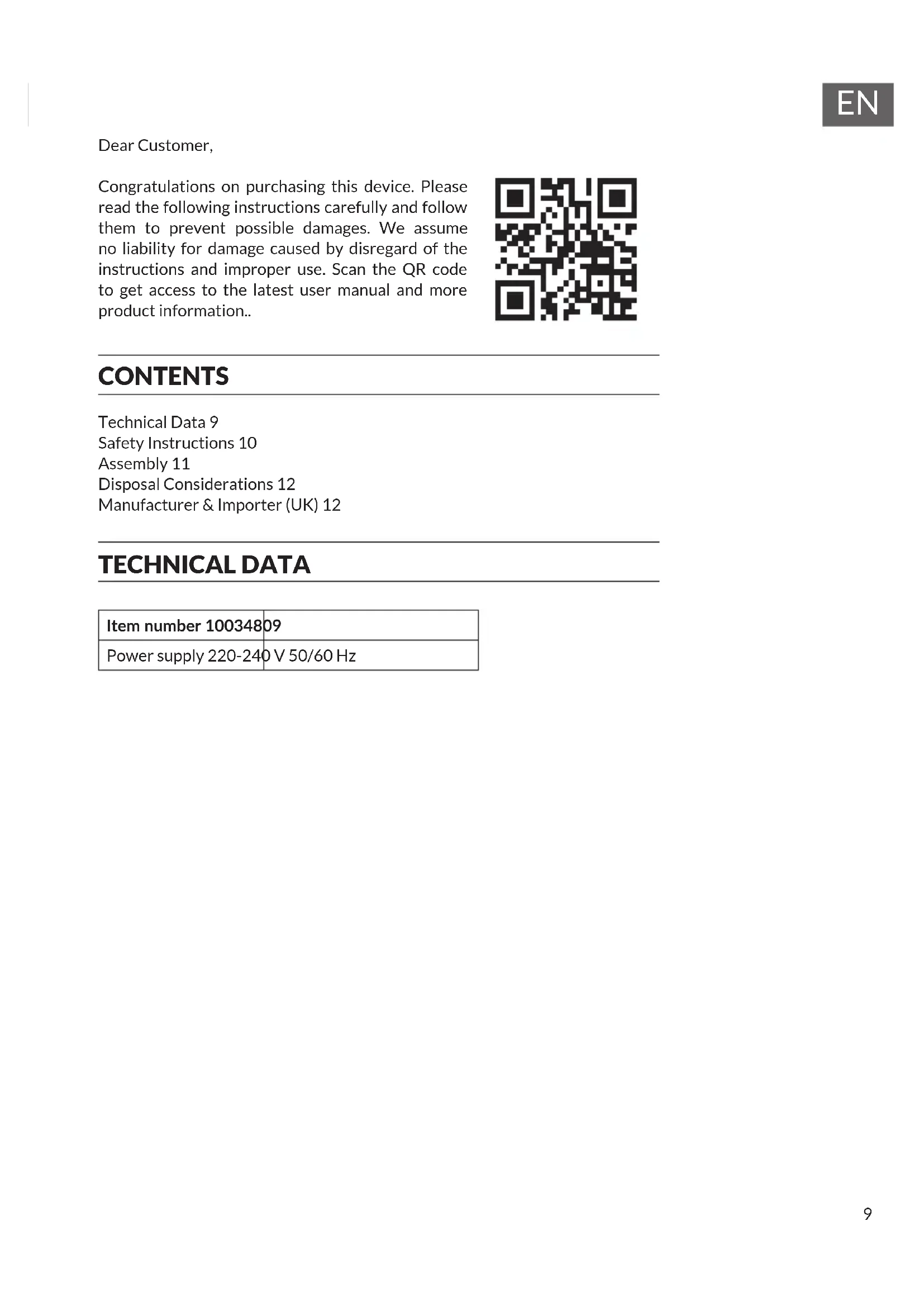 Dear Customer, Congratulations on purchasing this device. Please read the following instructions carefully and follow them to prevent possible damages. We assume no liability for damage caused by disregard of the instructions and improper use. Scan the QR code to get access to the latest user manual and more product information.. CONTENTS Technical Data 9 Safety Instructions 10 Assembly 11 Disposal Considerations 12 Manufacturer & Importer (UK) 12 TECHNICAL DATA Item number 10034809 Power supply 220-240 V 50/60 Hz10