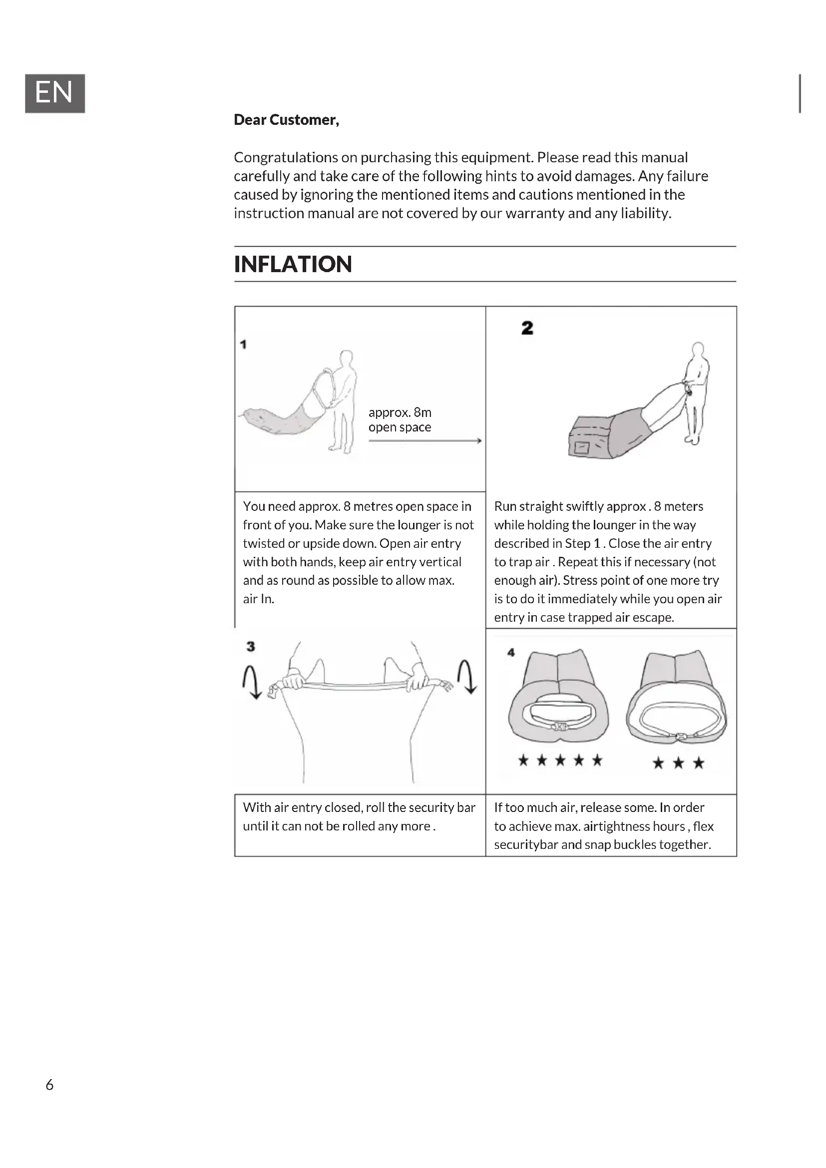 Dear Customer, Congratulations on purchasing this equipment. Please read this manual carefully and take care of the following hints to avoid damages. Any failure caused by ignoring the mentioned items and cautions mentioned in the instruction manual are not covered by our warranty and any liability. INFLATION You need approx. 8 metres open space in front of you. Make sure the lounger is not twisted or upside down. Open air entry with both hands, keep air entry vertical and as round as possible to allow max. air In. Run straight swiftly approx . 8 meters while holding the lounger in the way described in Step 1 . Close the air entry to trap air . Repeat this if necessary (not enough air). Stress point of one more try is to do it immediately while you open air entry in case trapped air escape. With air entry closed, roll the security bar until it can not be rolled any more . If too much air, release some. In order to achieve max. airtightness hours , ex securitybar and snap buckles together. approx. 8m open space7