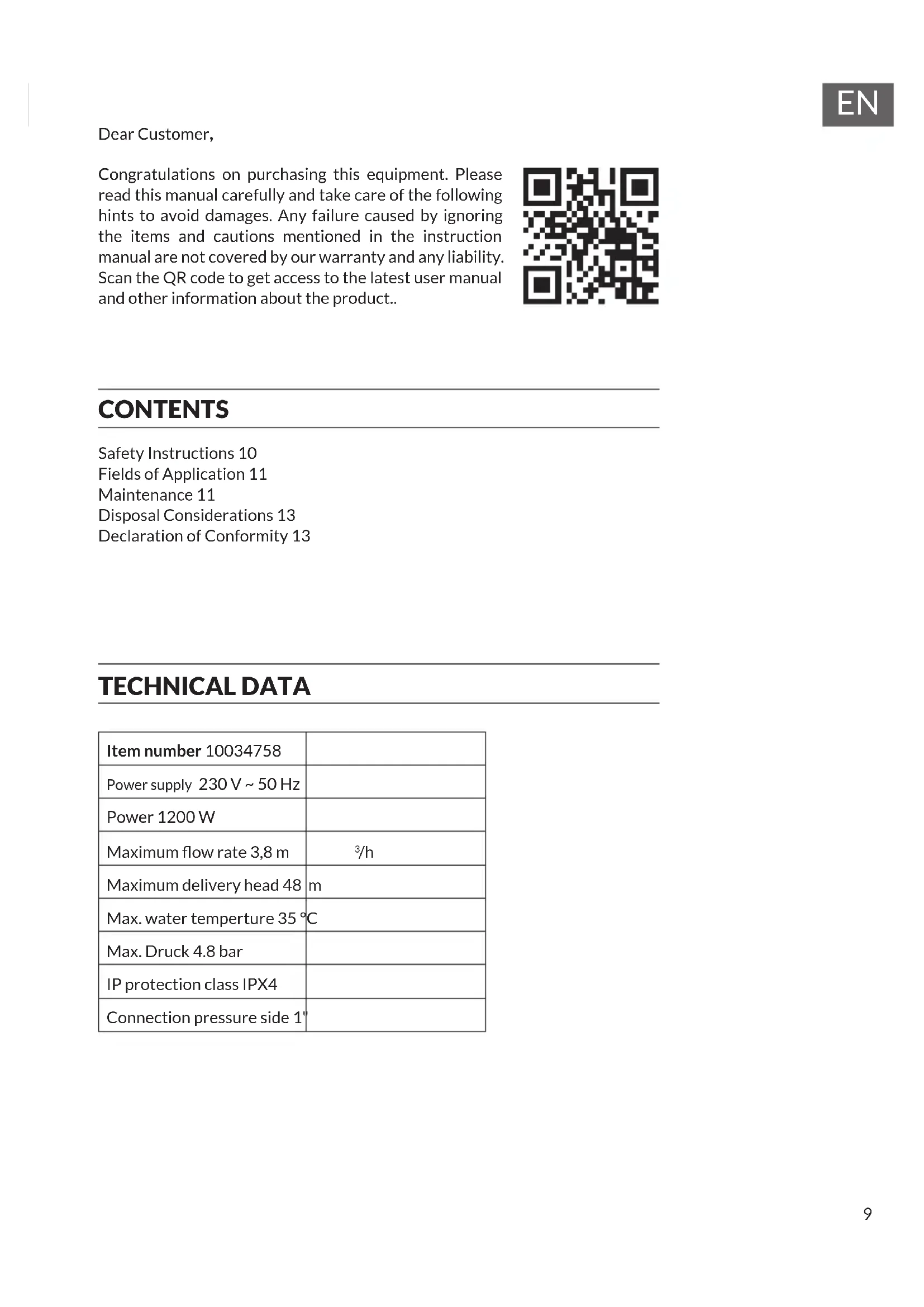 Safety Instructions 10 Fields of Application 11 Maintenance 11 Disposal Considerations 13 Declaration of Conformity 13 Dear Customer, Congratulations on purchasing this equipment. Please read this manual carefully and take care of the following hints to avoid damages. Any failure caused by ignoring the items and cautions mentioned in the instruction manual are not covered by our warranty and any liability. Scan the QR code to get access to the latest user manual and other information about the product.. TECHNICAL DATA Item number 10034758 Power supply 230V ~ 50Hz Power 1200 W Maximum ow rate 3,8 m