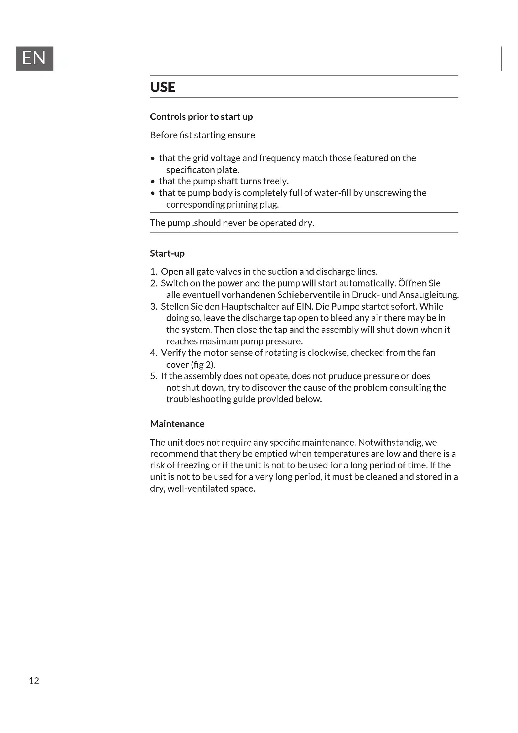 TROUBLESHOOTING Problem Cause Solution The unit does not shut down Tap or cistern leak. Repair leak. Air entering suction channel. Carefully seal all joints and connectors. Leak in discharge pipe- work. Repair leak. The motor oper- ates but provides no ow. Closed gate valve. Open valve. Air entering suction channel. Carefully seal all joints and connectors. The pressure is not sufcient. Total head height. Check geometric height plus loss of head. Air entering suction channel. Carefully seal all joints and connectors. Leak in discharge pipe- work. Repair leak. The unit is con- stantly stopping and starting. Tap or cistern leak. Repair leak. The unit does not start. Plump block. Call service agent. No power. Check fuses. The static head is greater than the assem- bly start pressure. Check start-up setting is correct.14