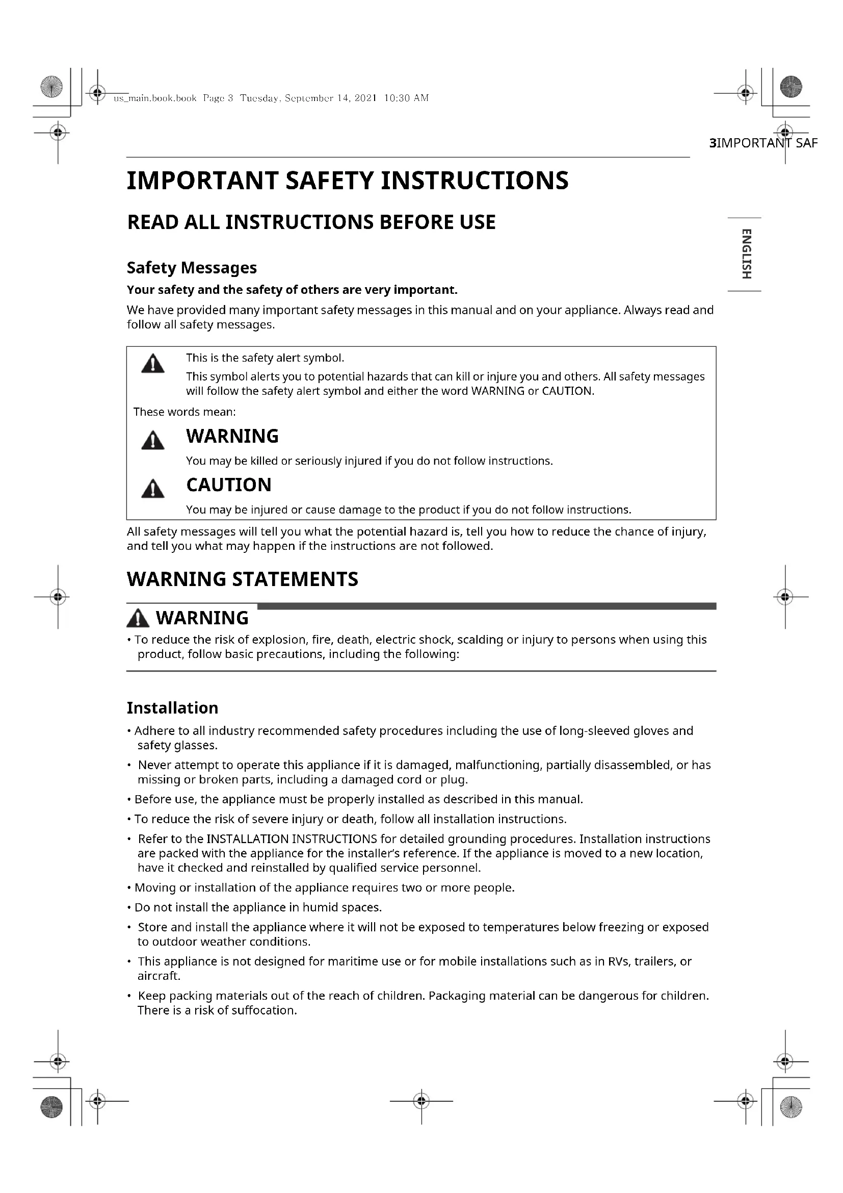 - Keep packing materials out of the reach of children. Packaging material can be dangerous for children. There is a risk of suffocation.This is the safety alert symbol.This symbol alerts you to potential hazards that can kill or injure you and others. All safety messages will follow the safety alert symbol and either the word WARNING or CAUTION. These words mean: WARNING You may be killed or seriously injured if you do not follow instructions. CAUTION You may be injured or cause damage to the product if you do not follow instructions.us_main.book.book Page 3 Tuesday, September 14, 2021 10:30 AM4 IMPORTANT SAFETY INSTRUCTIONS