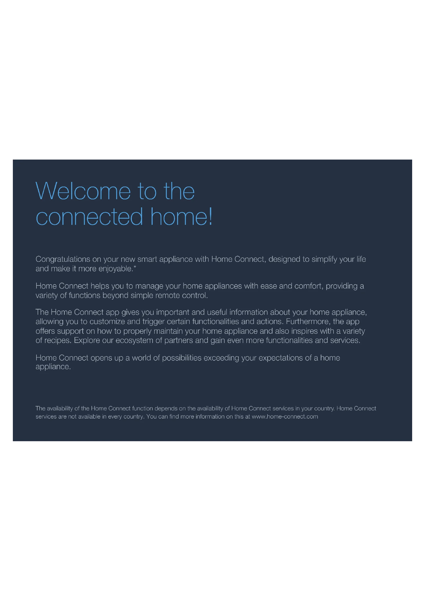 2 | Folgen Sie den Anweisungen in der App. Im Bedienfeld der Anzeige blinkt nicht mehr. Der Anmeldevorgang ist abgeschlossen. Hinweis: Wenn die Verbindung nicht hergestellt werden konnte, stellen Sie sicher, dass sich Ihr Smartphone/ Tablet in Reichweite Ihres Heimnetzwerks bendet.8 DE Congratulations on your new smart appliance with HomeConnect, designed to simplify your life and make it more enjoyable.* HomeConnect helps you to manage your home appliances with ease and comfort, providing a variety of functions beyond simple remote control. The HomeConnect app gives you important and useful information about your home appliance, allowing you to customize and trigger certain functionalities and actions. Furthermore, the app offers support on how to properly maintain your home appliance and also inspires with a variety of recipes. Explore our ecosystem of partners and gain even more functionalities and services. HomeConnect opens up a world of possibilities exceeding your expectations of a home appliance. The availability of the HomeConnect function depends on the availability of HomeConnect services in your country. HomeConnect services are not available in every country. You can nd more information on this at www.home-connect.com Welcome to the connected home!9 EN Explore: With the HomeConnect app you can... Manage your appliance In the app’s appliance section you have an overview of your connected home appliances, offering a variety of functions beyond simple remote control. Monitor the home appliance’s progress, change or pause programs, change settings, trigger actions, and receive notications. Be inspired The recipe section provides a variety of inspiring recipes, tips and videos, that will make cooking and baking even more enjoyable. Get support The service section gives helpful information on how to maintain and operate your home appliance properly. Discover even more benets We are constantly expanding our ecosystems of partners. Please refer to www.home-connect.com for an overview of all partners. Let’s get started: What you need 1 | Your extractor hood must be installed properly and plugged in. 2 | A smartphone or tablet equipped with a current version of iOS or Android operating system. 3 | Your extractor hood within the Wi-Fi signal of your home network. 4 | The name of your Wi-Fi network (SSID) and its password (key). 5 | This installation guide. Important Information: Data security: HomeConnect values customer data, ensuring the transfer of data is encrypted. HomeConnect utilizes a variety of security measures, which are periodically reviewed. For further information visit www.home-connect.com. Appliance safety: To ensure safe operation of your appliance with HomeConnect functionality, please consult the safety information in the appliance instruction manual.10 EN Step 2: Connect your extractor hood to your home network 1 | Your extractor hood must be installed properly and plugged in. 2 | Open your HomeConnect app to add your extractor hood. 3 | Please follow the directions in the app and refer to this guide only when prompted to by the app. Information: We are constantly working to improve the HomeConnect app, which may lead to differences in the setup steps. Please rely on the instructions in the latest version of the HomeConnect app to guide you through the setup process. Step 1: Download the HomeConnect app and create a user account 1 | Open the App Store (Apple devices) or Google Play Store (Android devices) on your smartphone or tablet. 2 | Search for "HomeConnect" in the Store and install the app. HomeConnect app: 3 | Open the app and register yourself so that you can create a HomeConnect user account. 4 | Make a note of your HomeConnect access data (user account and password) – you will need this later. The app will take you through the necessary steps for linking your appliance with HomeConnect. If necessary, the app will refer to these instructions.11 EN Step 2.1: Connect your extractor hood to your home network with WPS Please enter step 2.1 only when prompted to by the app. The following steps describe operations at the home appliance itself. Note: To connect the extractor hood to your home network, the hood and the light must be switched off. You can cancel the process at any time by pressing