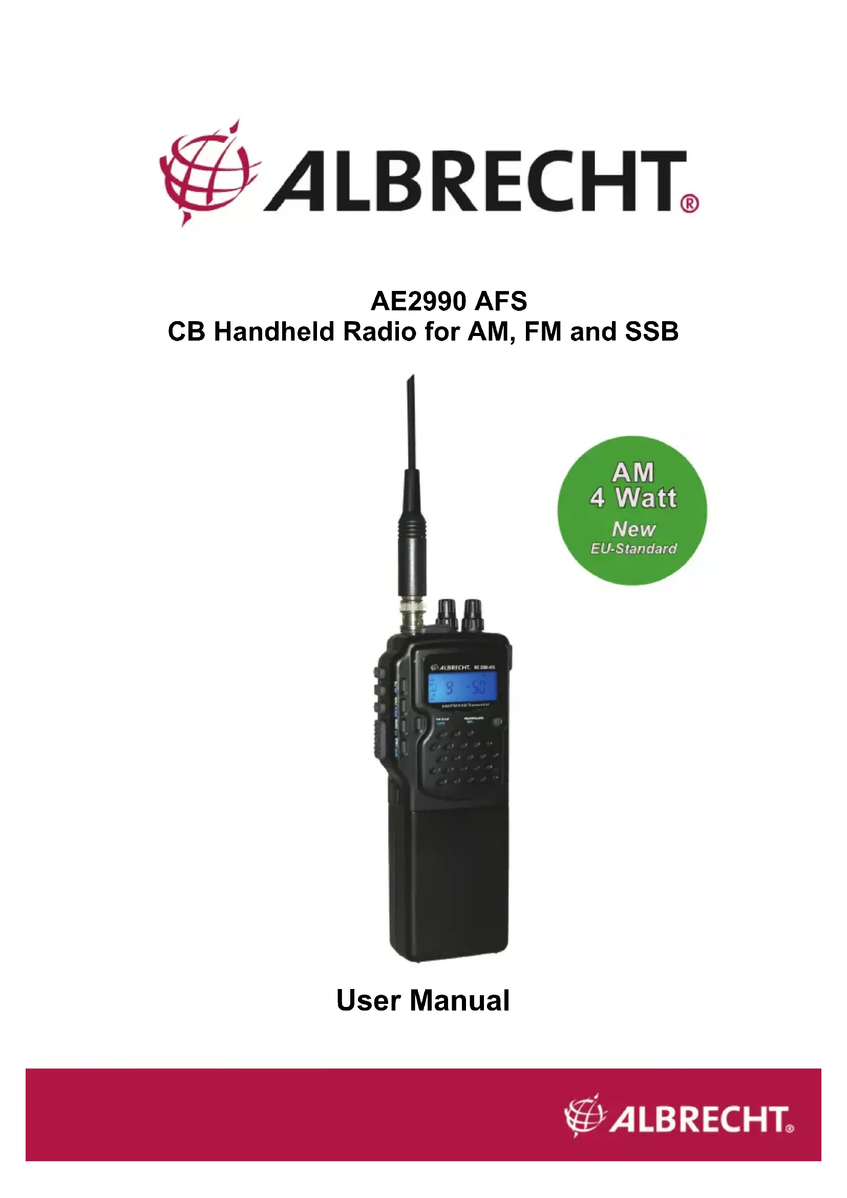 User Manual18 General: Albrecht hand portable radio AE 2990 AFS is a Multi-Standard CB Radio, which can be switched to all CB standards used within Europe. The radio can be used as portable radio with rechargeable batteries, but as well as mobile radio with optional mobile adaptor or as CB base station in connection with an external antenna and an external power supply.