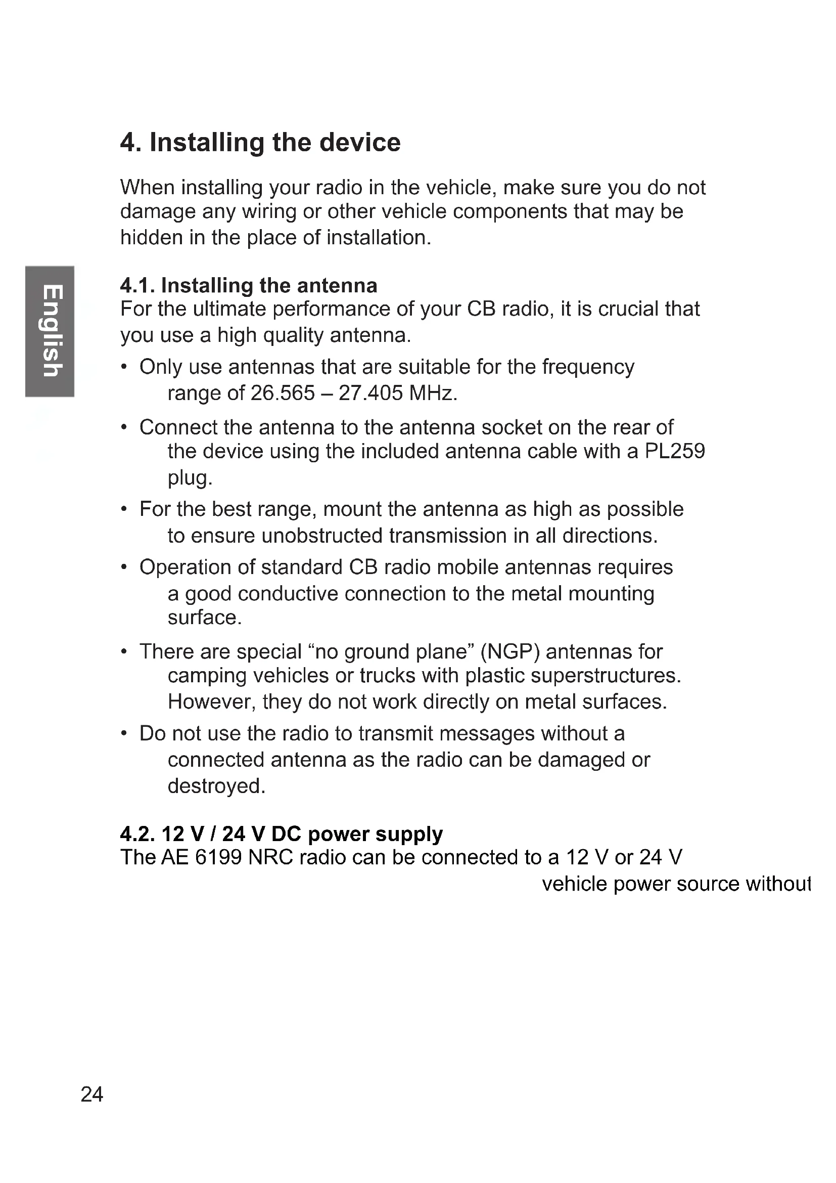 - Do not use the radio to transmit messages without a connected antenna as the radio can be damaged or destroyed. 4.2. 4.2. 12 V / 24 V DC power supply12 V / 24 V DC power supply The AE 6199 NRC radio can be connected to a 12 V or 24 V The AE 6199 NRC radio can be connected to a 12 V or 24 V vehicle power source without reconguration.vehicle power source without reconguration.25 English