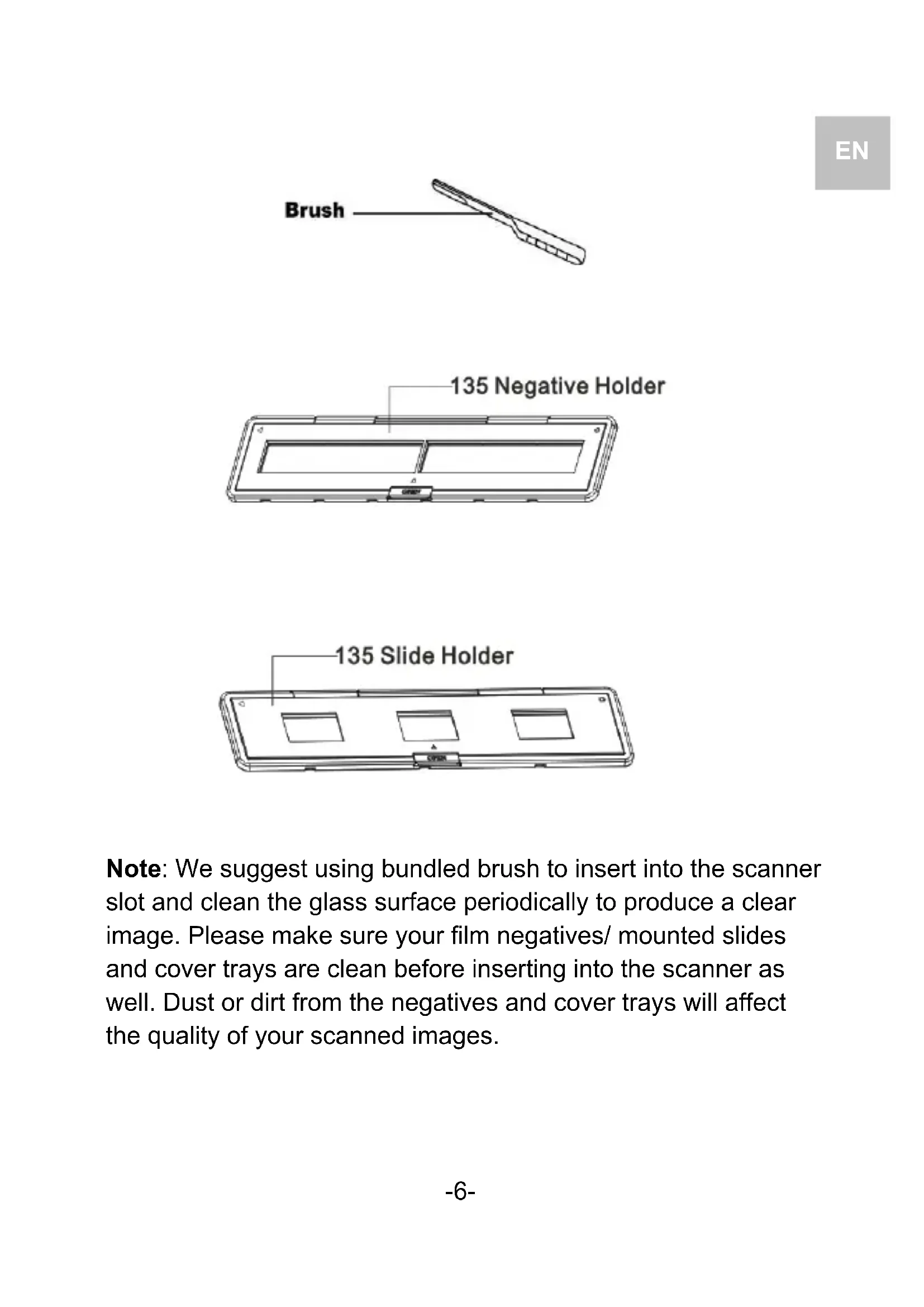 Note: We suggest using bundled brush to insert into the scanner slot and clean the glass surface periodically to produce a clear image. Please make sure your film negatives/ mounted slides and cover trays are clean before inserting into the scanner as well. Dust or dirt from the negatives and cover trays will affect the quality of your scanned images.