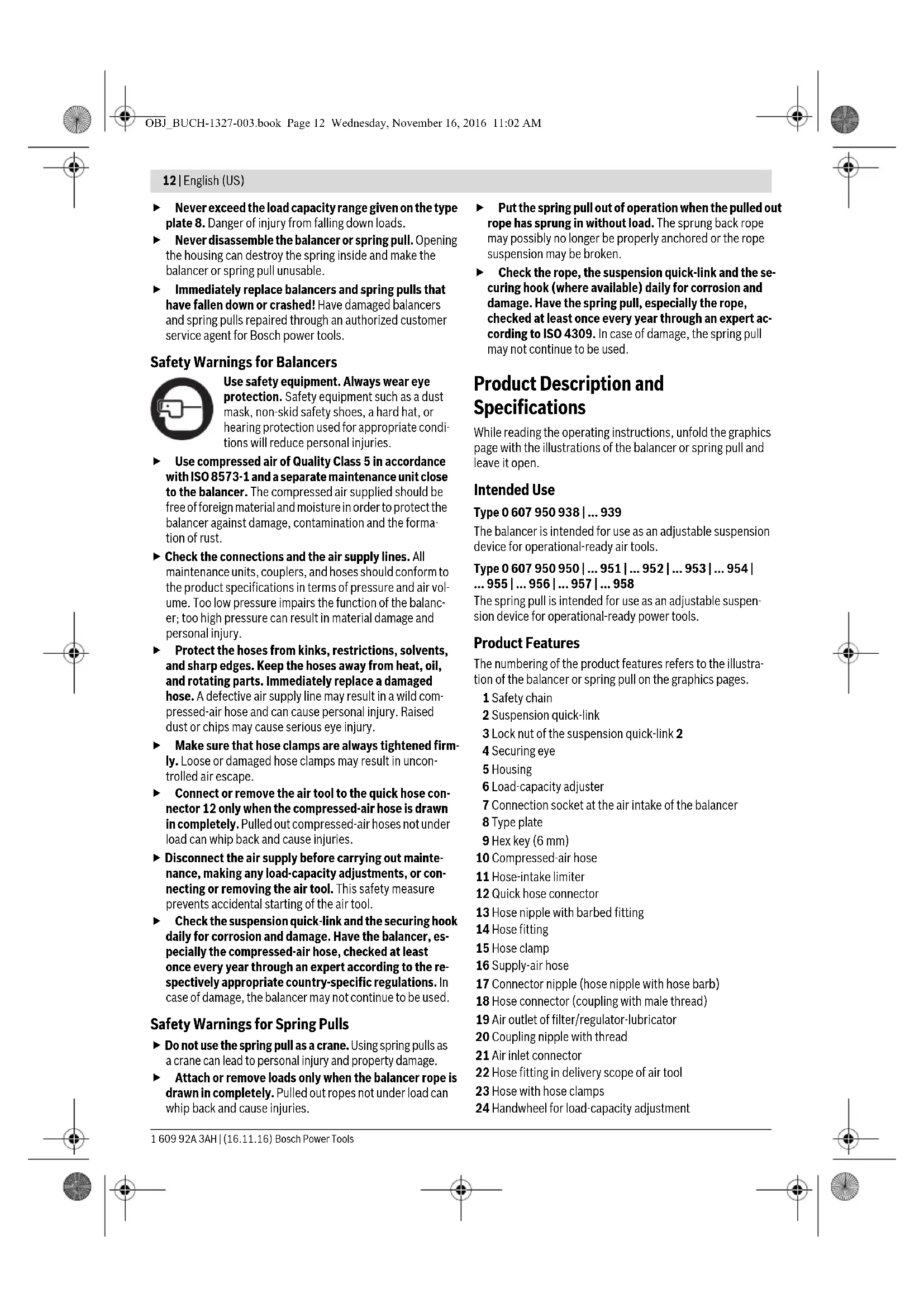 - REFERENCE. Balancers and spring pulls may be installed and main- tained only through qualified persons. The qualified persons must be aware of the possible hazards when performing such work. Do not install balancers and spring pulls with plastic housings in the direct vicinity of hot air blowers. Never operate balancers and spring pulls provided with a securing hook 4 and a securing chain 1 without them. Electrically insulate balancers and spring pulls when attaching welding tongs to them. Install the balancer or spring pull in such a manner that operating personnel does not work below suspended loads. When pulling the tool on the balancer or spring pull toward your workpiece, the angle should not ex- ceed 10° (max.). Tools pulled at a larger angle can bounce back and forth after releasing them, and injure persons. OBJ_BUCH-1327-003.book Page 11 Wednesday, November 16, 2016 11:02 AM12 | English (US) 1 609 92A 3AH | (16.11.16) Bosch Power Tools Never exceed the load capacity range given on the type plate 8. Danger of injury from falling down loads. Never disassemble the balancer or spring pull. Opening the housing can destroy the spring inside and make the balancer or spring pull unusable. Immediately replace balancers and spring pulls that have fallen down or crashed! Have damaged balancers and spring pulls repaired through an authorized customer service agent for Bosch power tools. Safety Warnings for Balancers Use safety equipment. Always wear eye protection. Safety equipment such as a dust mask, non-skid safety shoes, a hard hat, or hearing protection used for appropriate condi- tions will reduce personal injuries. Use compressed air of Quality Class 5 in accordance with ISO 8573-1 and a separate maintenance unit close to the balancer. The compressed air supplied should be free of foreign material and moisture in order to protect the balancer against damage, contamination and the forma- tion of rust. Check the connections and the air supply lines. All maintenance units, couplers, and hoses should conform to the product specifications in terms of pressure and air vol- ume. Too low pressure impairs the function of the balanc- er; too high pressure can result in material damage and personal injury. Protect the hoses from kinks, restrictions, solvents, and sharp edges. Keep the hoses away from heat, oil, and rotating parts. Immediately replace a damaged hose. A defective air supply line may result in a wild com- pressed-air hose and can cause personal injury. Raised dust or chips may cause serious eye injury. Make sure that hose clamps are always tightened firm- ly. Loose or damaged hose clamps may result in uncon- trolled air escape. Connect or remove the air tool to the quick hose con- nector 12 only when the compressed-air hose is drawn in completely. Pulled out compressed-air hoses not under load can whip back and cause injuries. Disconnect the air supply before carrying out mainte- nance, making any load-capacity adjustments, or con- necting or removing the air tool. This safety measure prevents accidental starting of the air tool. Check the suspension quick-link and the securing hook daily for corrosion and damage. Have the balancer, es- pecially the compressed-air hose, checked at least once every year through an expert according to the re- spectively appropriate country-specific regulations. In case of damage, the balancer may not continue to be used. Safety Warnings for Spring Pulls Do not use the spring pull as a crane. Using spring pulls as a crane can lead to personal injury and property damage. Attach or remove loads only when the balancer rope is drawn in completely. Pulled out ropes not under load can whip back and cause injuries. Put the spring pull out of operation when the pulled out rope has sprung in without load. The sprung back rope may possibly no longer be properly anchored or the rope suspension may be broken. Check the rope, the suspension quick-link and the se- curing hook (where available) daily for corrosion and damage. Have the spring pull, especially the rope, checked at least once every year through an expert ac- cording to ISO 4309. In case of damage, the spring pull may not continue to be used. Product Description and Specifications While reading the operating instructions, unfold the graphics page with the illustrations of the balancer or spring pull and leave it open. Intended Use Type 0 607 950 938 | p. 939