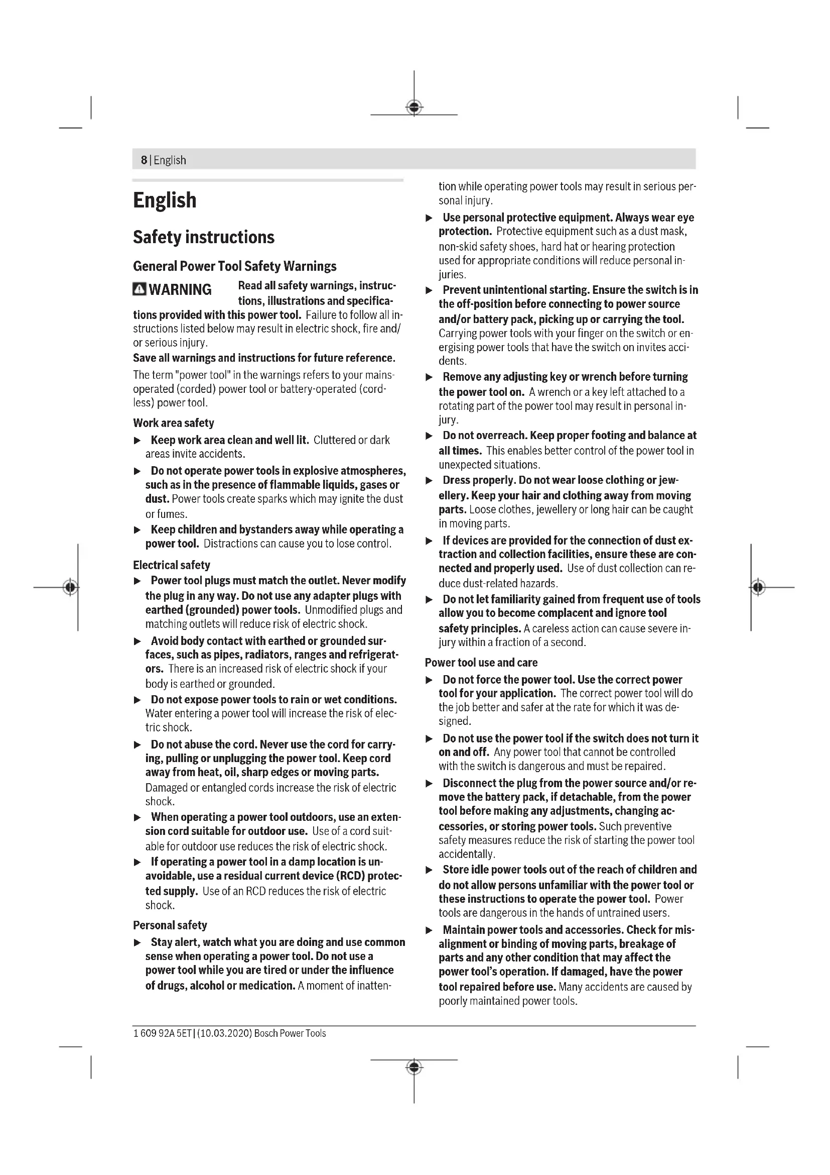 (17) (16) Bosch Power Tools 1 609 92A 5ET | (10.03.2020)8 | English English Safety instructions General Power Tool Safety Warnings WARNING Read all safety warnings, instruc- tions, illustrations and specifica- tions provided with this power tool. Failure to follow all in- structions listed below may result in electric shock, fire and/ or serious injury. Save all warnings and instructions for future reference. The term "power tool" in the warnings refers to your mains- operated (corded) power tool or battery-operated (cord- less) power tool. Work area safety u Keep work area clean and well lit. Cluttered or dark areas invite accidents. u Do not operate power tools in explosive atmospheres, such as in the presence of flammable liquids, gases or dust. Power tools create sparks which may ignite the dust or fumes. u Keep children and bystanders away while operating a power tool. Distractions can cause you to lose control. Electrical safety u Power tool plugs must match the outlet. Never modify the plug in any way. Do not use any adapter plugs with earthed (grounded) power tools. Unmodified plugs and matching outlets will reduce risk of electric shock. u Avoid body contact with earthed or grounded sur- faces, such as pipes, radiators, ranges and refrigerat- ors. There is an increased risk of electric shock if your body is earthed or grounded. u Do not expose power tools to rain or wet conditions. Water entering a power tool will increase the risk of elec- tric shock. u Do not abuse the cord. Never use the cord for carry- ing, pulling or unplugging the power tool. Keep cord away from heat, oil, sharp edges or moving parts. Damaged or entangled cords increase the risk of electric shock. u When operating a power tool outdoors, use an exten- sion cord suitable for outdoor use. Use of a cord suit- able for outdoor use reduces the risk of electric shock. u If operating a power tool in a damp location is un- avoidable, use a residual current device (RCD) protec- ted supply. Use of an RCD reduces the risk of electric shock. Personal safety u Stay alert, watch what you are doing and use common sense when operating a power tool. Do not use a power tool while you are tired or under the influence of drugs, alcohol or medication. A moment of inatten- tion while operating power tools may result in serious per- sonal injury. u Use personal protective equipment. Always wear eye protection. Protective equipment such as a dust mask, non-skid safety shoes, hard hat or hearing protection used for appropriate conditions will reduce personal in- juries. u Prevent unintentional starting. Ensure the switch is in the off-position before connecting to power source and/or battery pack, picking up or carrying the tool. Carrying power tools with your finger on the switch or en- ergising power tools that have the switch on invites acci- dents. u Remove any adjusting key or wrench before turning the power tool on. A wrench or a key left attached to a rotating part of the power tool may result in personal in- jury. u Do not overreach. Keep proper footing and balance at all times. This enables better control of the power tool in unexpected situations. u Dress properly. Do not wear loose clothing or jew- ellery. Keep your hair and clothing away from moving parts. Loose clothes, jewellery or long hair can be caught in moving parts. u If devices are provided for the connection of dust ex- traction and collection facilities, ensure these are con- nected and properly used. Use of dust collection can re- duce dust-related hazards. u Do not let familiarity gained from frequent use of tools allow you to become complacent and ignore tool safety principles. A careless action can cause severe in- jury within a fraction of a second. Power tool use and care u Do not force the power tool. Use the correct power tool for your application. The correct power tool will do the job better and safer at the rate for which it was de- signed. u Do not use the power tool if the switch does not turn it on and off. Any power tool that cannot be controlled with the switch is dangerous and must be repaired. u Disconnect the plug from the power source and/or re- move the battery pack, if detachable, from the power tool before making any adjustments, changing ac- cessories, or storing power tools. Such preventive safety measures reduce the risk of starting the power tool accidentally. u Store idle power tools out of the reach of children and do not allow persons unfamiliar with the power tool or these instructions to operate the power tool. Power tools are dangerous in the hands of untrained users. u Maintain power tools and accessories. Check for mis- alignment or binding of moving parts, breakage of parts and any other condition that may affect the power tool’s operation. If damaged, have the power tool repaired before use. Many accidents are caused by poorly maintained power tools. 1 609 92A 5ET | (10.03.2020) Bosch Power ToolsEnglish | 9 u Keep cutting tools sharp and clean. Properly main- tained cutting tools with sharp cutting edges are less likely to bind and are easier to control. u Use the power tool, accessories and tool bits etc. in accordance with these instructions, taking into ac- count the working conditions and the work to be per- formed. Use of the power tool for operations different from those intended could result in a hazardous situation. u Keep handles and grasping surfaces dry, clean and free from oil and grease. Slippery handles and grasping surfaces do not allow for safe handling and control of the tool in unexpected situations. Battery tool use and care u Recharge only with the charger specified by the manu- facturer. A charger that is suitable for one type of bat- tery pack may create a risk of fire when used with another battery pack. u Use power tools only with specifically designated bat- tery packs. Use of any other battery packs may create a risk of injury and fire. u When battery pack is not in use, keep it away from other 