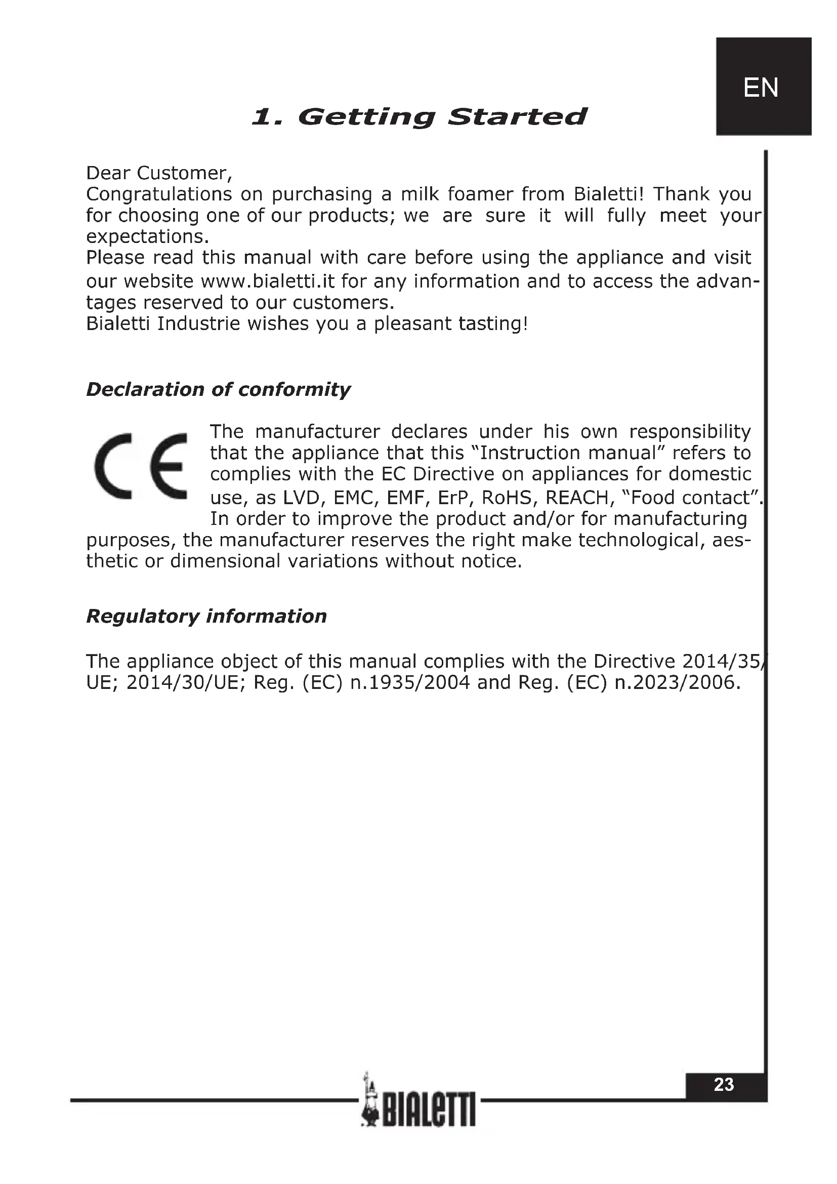 Dear Customer, Congratulations on purchasing a milk foamer from Bialetti! Thank you for choosing one of our products; we are sure it will fully meet your expectations. Please read this manual with care before using the appliance and visit our website www.bialetti.it for any information and to access the advan- tages reserved to our customers. Bialetti Industrie wishes you a pleasant tasting! Declaration of conformity The manufacturer declares under his own responsibility that the appliance that this “Instruction manual” refers to complies with the EC Directive on appliances for domestic use, as LVD, EMC, EMF, ErP, RoHS, REACH, “Food contact”. In order to improve the product and/or for manufacturing purposes, the manufacturer reserves the right make technological, aes- thetic or dimensional variations without notice. Regulatory information The appliance object of this manual complies with the Directive 2014/35/ UE; 2014/30/UE; Reg. (EC) n.1935/2004 and Reg. (EC) n.2023/2006.EN