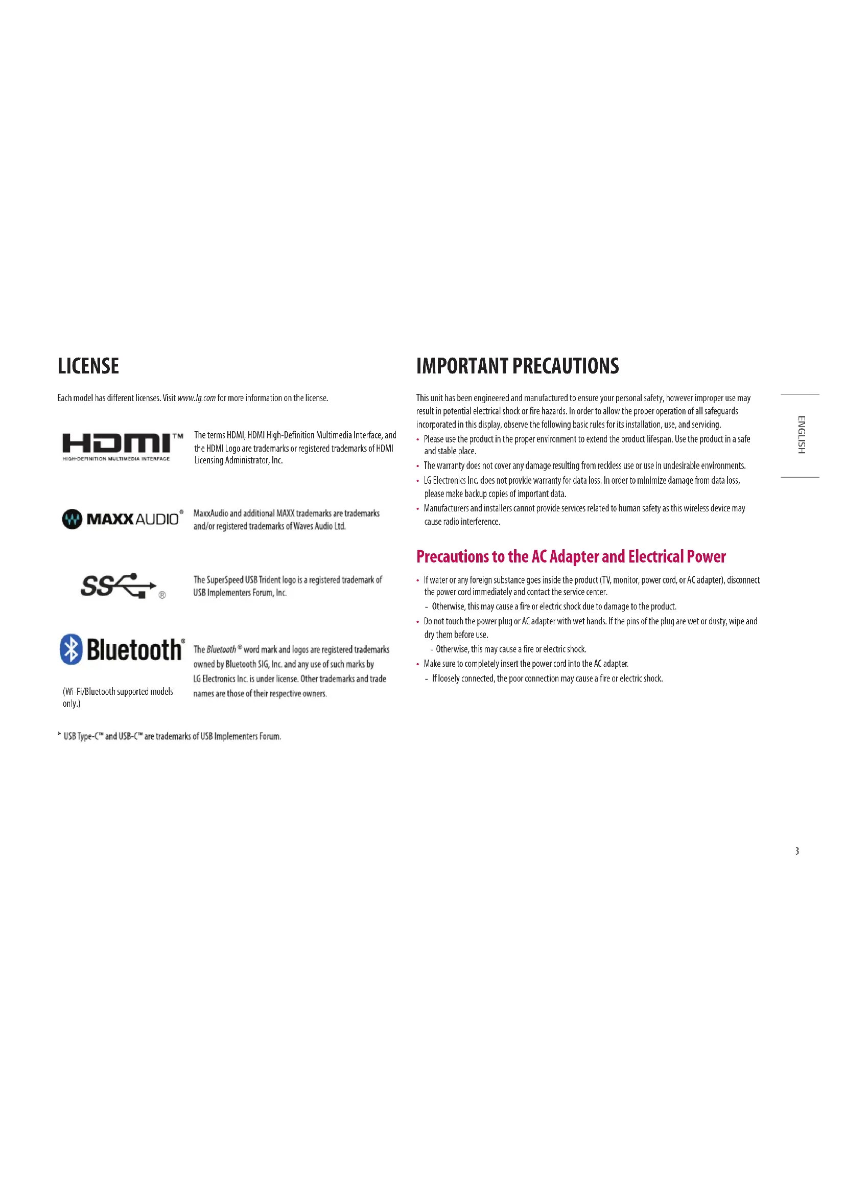 - Be sure to use power cords and AC adapters provided or approved by LG Electronics, Inc. - The use of non-approved products may cause a fire or electric shock.