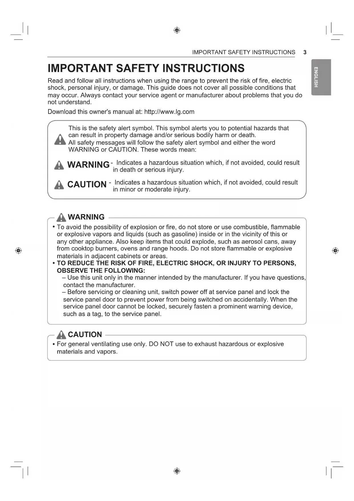 Read and follow all instructions when using the range to prevent the risk of fire, electric shock, personal injury, or damage. This guide does not cover all possible conditions that may occur. Always contact your service agent or manufacturer about problems that you do not understand. Download this owner's manual at: http://www.lg.com This is the safety alert symbol. This symbol alerts you to potential hazards that can result in property damage and/or serious bodily harm or death. All safety messages will follow the safety alert symbol and either the word WARNING or CAUTION. These words mean: WARNINg - Indicates a hazardous situation which, if not avoided, could result in death or serious injury. CAUTION - Indicates a hazardous situation which, if not avoided, could result in minor or moderate injury. WARNINg