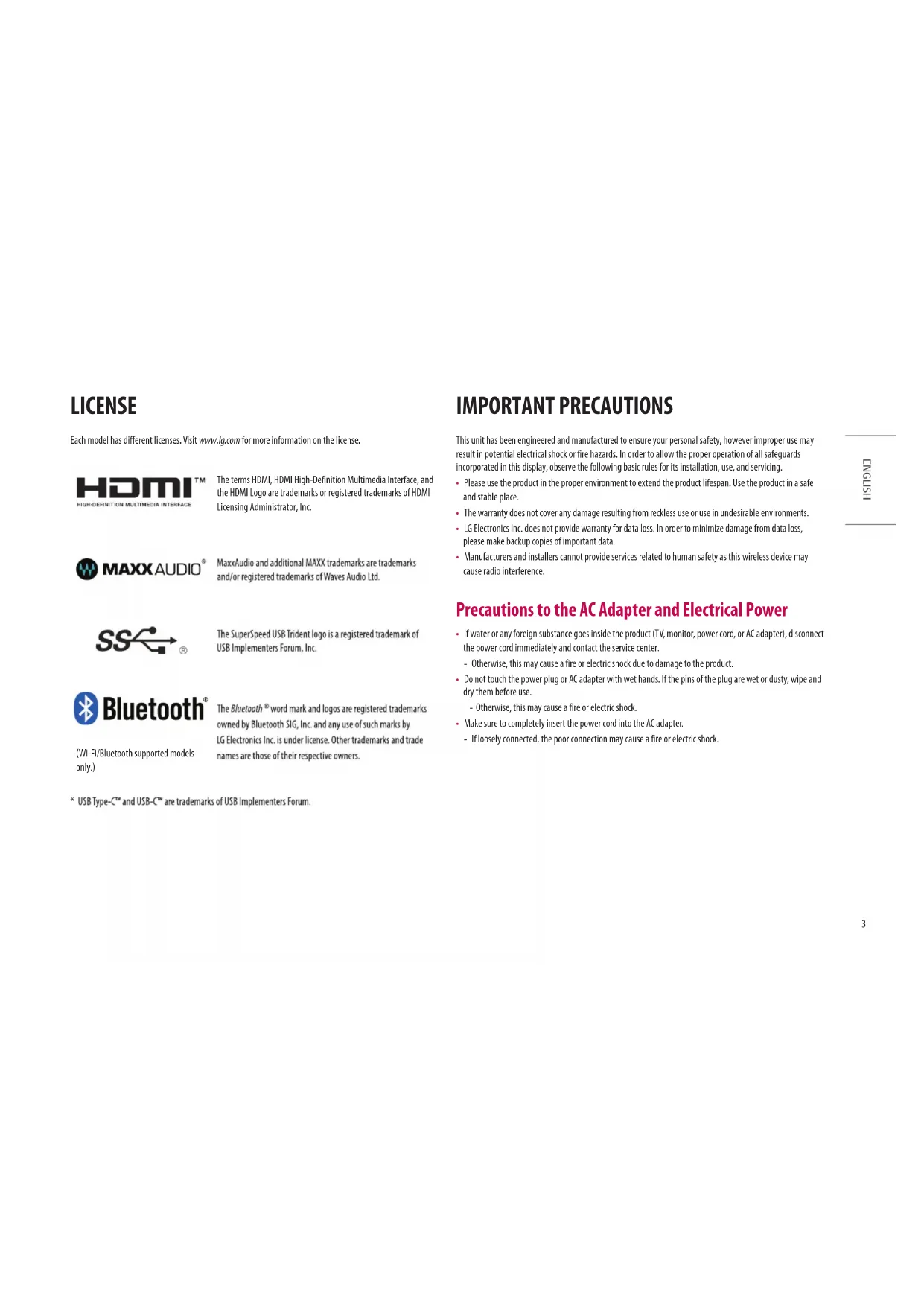 - The Power Consumption level can be different by operating condition and monitor setting.29 ENGLISH Wireless module (AC9560) Specifications (Wi-Fi/Bluetooth supported models only.) Wireless LAN (IEEE 802.11a/b/g/n/ac) Frequency Range Output Power (Max.) 2400 to 2483.5MHz 5150 to 5725MHz 5725 to 5850MHz 20dBm 20dBm 20dBm Bluetooth Frequency Range Output Power (Max.) 2400 to 2483.5MHz 10dBm