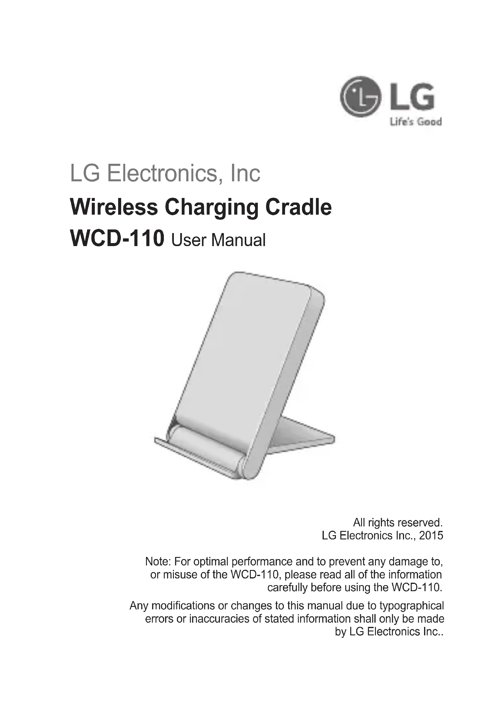 Rev 2.0 EU All rights reserved. LG Electronics Inc., 2015 LG Electronics, Inc Wireless Charging Cradle WCD-110 User Manual www.lg.com Contact ofce for compliance of this product : LG Electronics Inc. EU Representative, Krijgsman 1, 1186 DM Amstelveen, The Netherlands English Français Deutsch Español Italiano Nederland Dansk Norsk Svenska Polski Magyar Hrvatski Português Eλληvικά Čeština SlovenskyLG Electronics, Inc Wireless Charging Cradle WCD-110 User Manual All rights reserved. LG Electronics Inc., 2015 Note: For optimal performance and to prevent any damage to, or misuse of the WCD-110, please read all of the information carefully before using the WCD-110. Any modications or changes to this manual due to typographical errors or inaccuracies of stated information shall only be made by LG Electronics Inc..ENG ENG