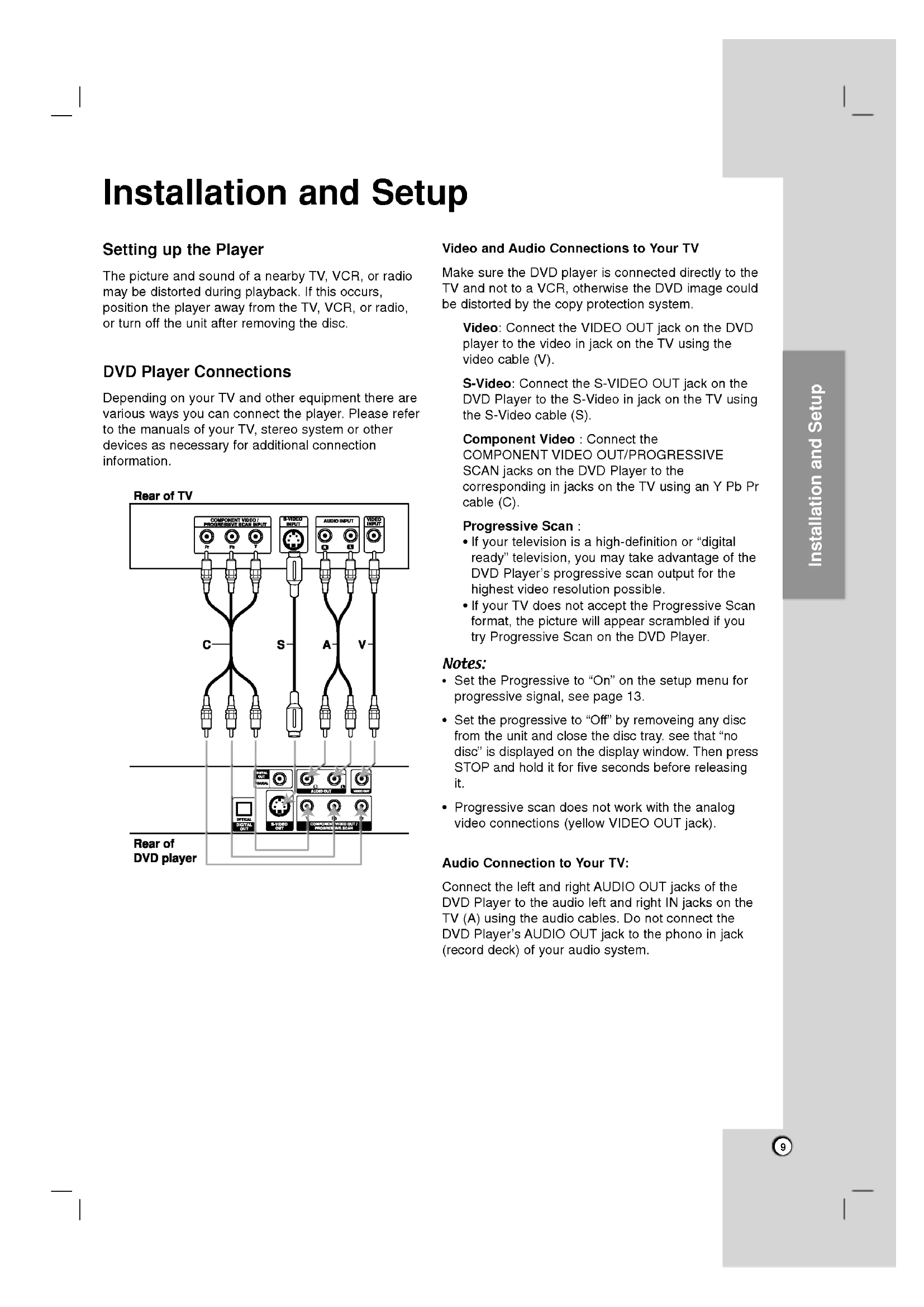 the Player The picture andsoundofa nearby TV,VCR,orradiomaybedistorted during playback. Ifthisoccurs, position the player awayfromtheTV,VCR,orradio,or turn offtheunitafter removing thedisc.DVD Player Connections Depending onyourTVandother equipment therearevariouswaysyoucan connect the player. Pleaserefer themanualsofyourTV, stereo systemorotherdevicesasnecessaryforadditionalconnectioninformation.VideoandAudioConnectionstoYourTVMakesuretheDVD player isconnected directly