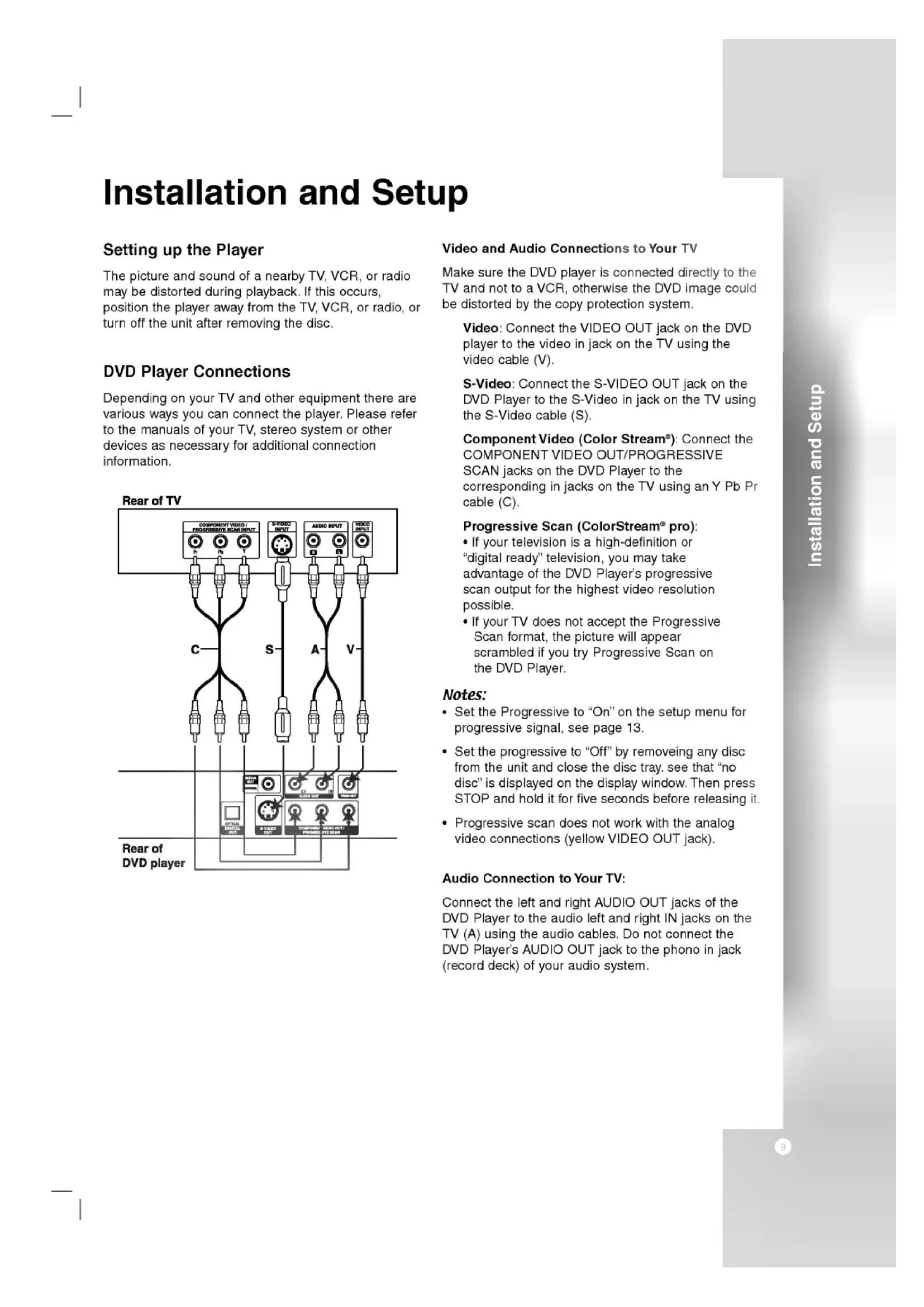 IfyourTVdoesnot accept the Progressive Scan format, the picture willappearscrambledifyou try Progressive ScanontheDVD Player. Notes: