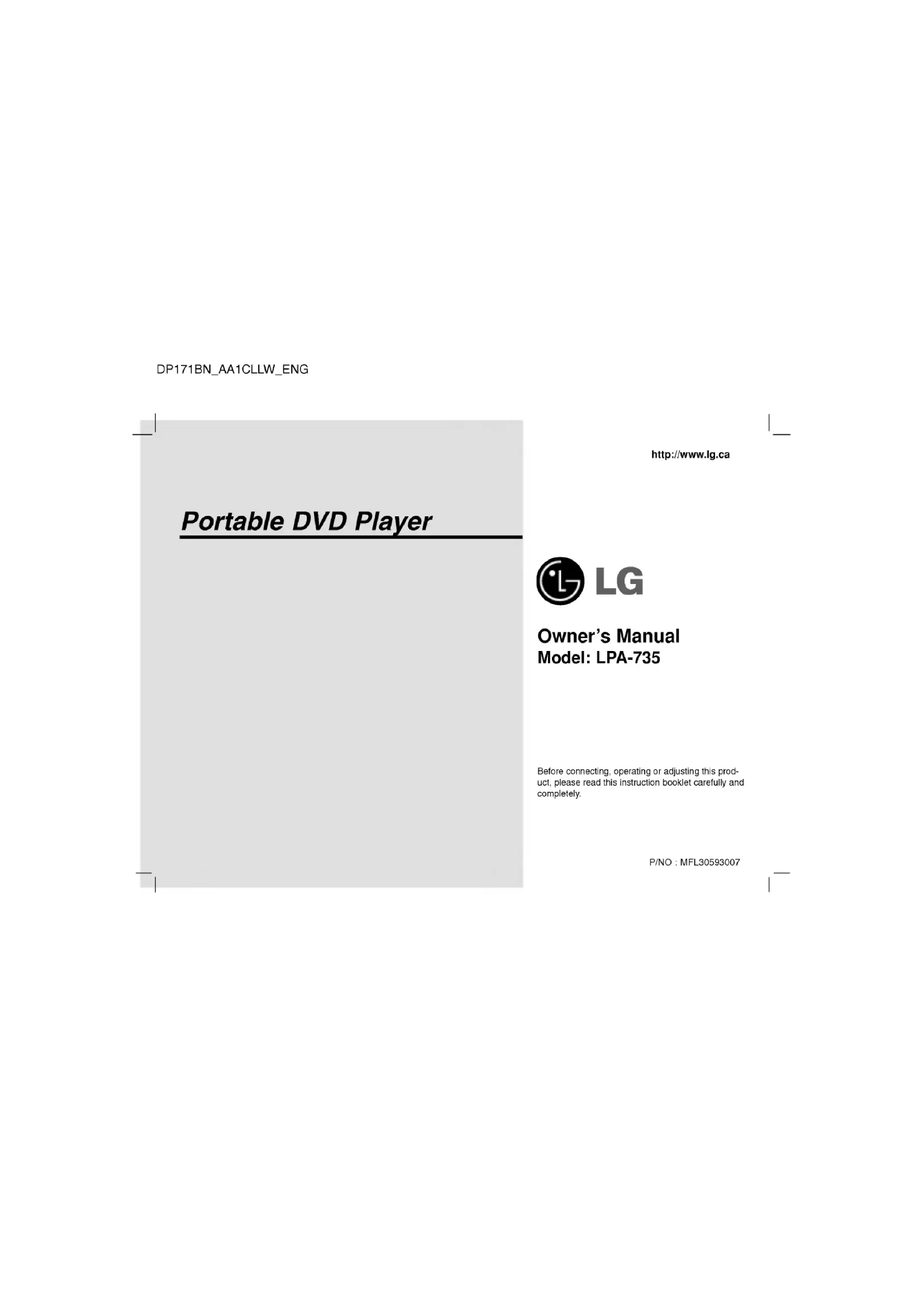Portable DVD Player Beforeconnecting,operatingoradjustingthisprod-uct,pleasereadthisinstructionbookletcarefullyandcompletely. Owner's Manual Model:LPA-735P/NO MFL30593007
