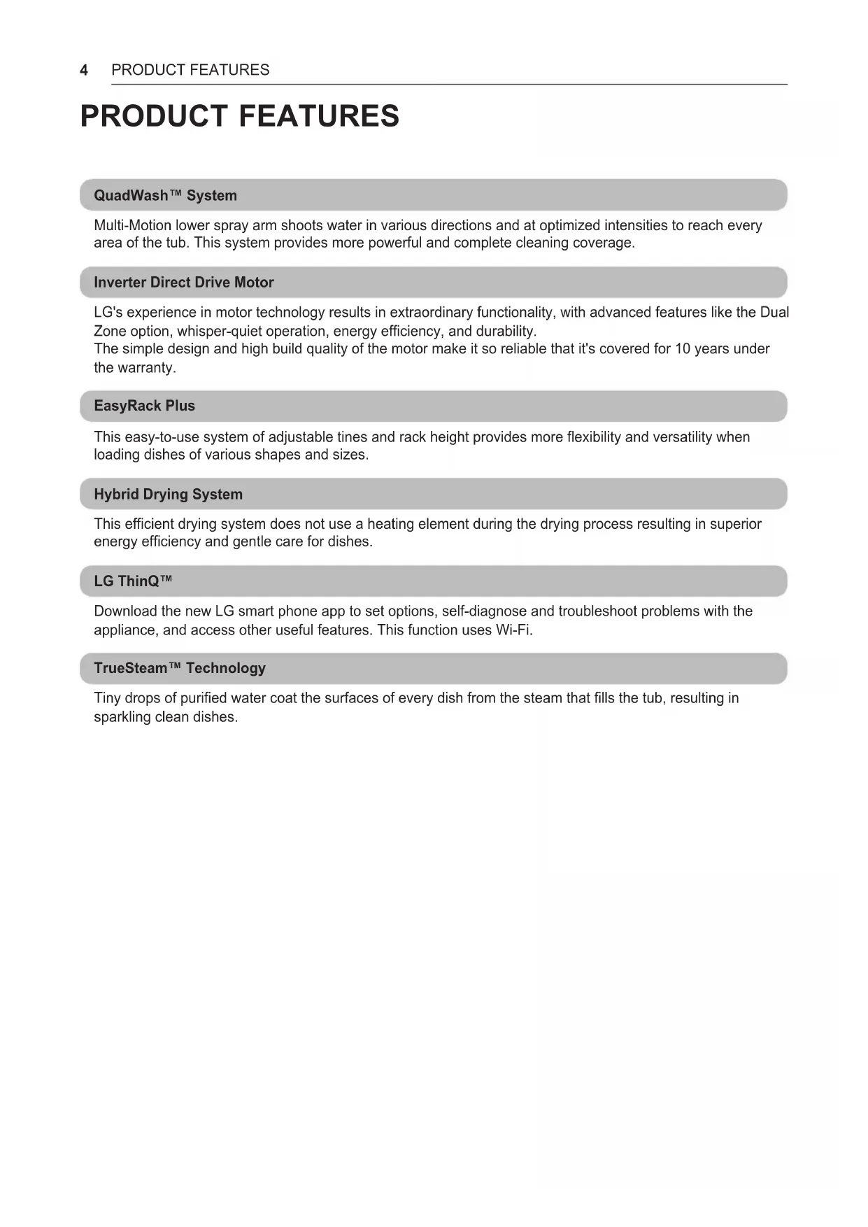 10 PRODUCT OVERVIEW 10 Exterior Parts 11 Interior Parts 12 Accessories 13 INSTALLATION 13 Installation Parts and Tools 14 Installation Overview 14 Product Dimensions 14 Product Specifications 15 Preparing Cabinet Opening 16 Preparing Water and Electrical Connections 17 Preparing Dishwasher 18 Attaching Installation Brackets 19 Sliding Dishwasher into Cabinet Opening 21 Connecting Water Supply Line and Power 23 Connecting Drain Hose 25 Leveling Dishwasher 27 Securing Dishwasher to Cabinet Opening 28 Final Installation Check 29 OPERATION 29 Using the Appliance 30 Control Panel 31 Cycles 32 Options 33 Cycle/Option Guide 34 Loading the Dishwasher 34 Loading the Lower Rack 36 Loading the Silverware Basket 37 Loading the Upper Rack 40 Loading the Cutlery Rack 42 Adding Cleaning Agents 44 SMART FUNCTIONS 44 LG ThinQ Application 46 Smart Diagnosis™ Function 47 MAINTENANCE 47 Cleaning the Exterior 47 Cleaning the Interior 47 Seasonal Maintenance and Storage 48 Clogged Drain Air Gap or In-Sink Disposal 49 Cleaning the Filters 50 Cleaning the Spray Arms 51 TROUBLESHOOTING 51 FAQs: Frequently Asked Questions 54 Before Calling for Service 59 LIMITED WARRANTY 59 USA 63 CANADA 67 Warranty Exceptions (U.S. and Canada) Rev.01_0312204 PRODUCT FEATURES PRODUCT FEATURES QuadWash™ System Multi-Motion lower spray arm shoots water in various directions and at optimized intensities to reach every area of the tub. This system provides more powerful and complete cleaning coverage. Inverter Direct Drive Motor LG's experience in motor technology results in extraordinary functionality, with advanced features like the Dual Zone option, whisper-quiet operation, energy efficiency, and durability. The simple design and high build quality of the motor make it so reliable that it's covered for 10 years under the warranty. EasyRack Plus This easy-to-use system of adjustable tines and rack height provides more flexibility and versatility when loading dishes of various shapes and sizes. Hybrid Drying System This efficient drying system does not use a heating element during the drying process resulting in superior energy efficiency and gentle care for dishes. LG ThinQ™ Download the new LG smart phone app to set options, self-diagnose and troubleshoot problems with the appliance, and access other useful features. This function uses Wi-Fi. TrueSteam™ Technology Tiny drops of purified water coat the surfaces of every dish from the steam that fills the tub, resulting in sparkling clean dishes.5 SAFETY INSTRUCTIONSENGLISH SAFETY INSTRUCTIONS