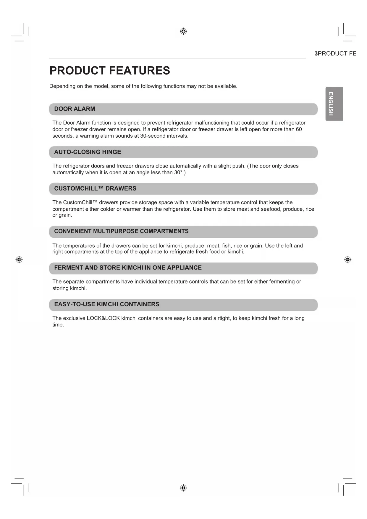 ENGLISH PRODUCT FEATURES Depending on the model, some of the following functions may not be available. DOOR ALARM The Door Alarm function is designed to prevent refrigerator malfunctioning that could occur if a refrigerator door or freezer drawer remains open. If a refrigerator door or freezer drawer is left open for more than 60 seconds, a warning alarm sounds at 30-second intervals. AUTO-CLOSING HINGE The refrigerator doors and freezer drawers close automatically with a slight push. (The door only closes automatically when it is open at an angle less than 30°.) CUSTOMCHILL™ DRAWERS The CustomChill™ drawers provide storage space with a variable temperature control that keeps the compartment either colder or warmer than the refrigerator. Use them to store meat and seafood, produce, rice or grain.
