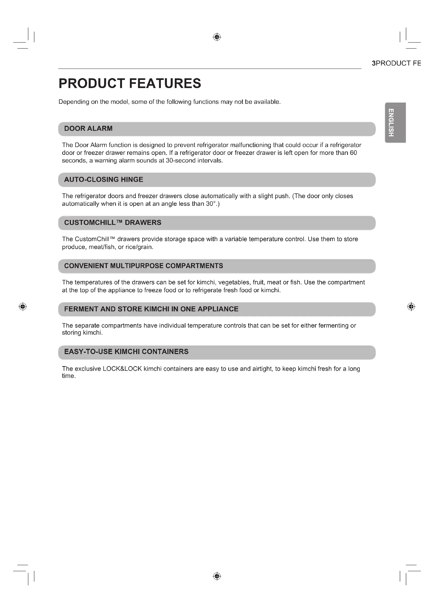 ENGLISH PRODUCT FEATURES Depending on the model, some of the following functions may not be available. DOOR ALARM The Door Alarm function is designed to prevent refrigerator malfunctioning that could occur if a refrigerator door or freezer drawer remains open. If a refrigerator door or freezer drawer is left open for more than 60 seconds, a warning alarm sounds at 30-second intervals. AUTO-CLOSING HINGE The refrigerator doors and freezer drawers close automatically with a slight push. (The door only closes automatically when it is open at an angle less than 30°.) CUSTOMCHILL™ DRAWERS The CustomChill™ drawers provide storage space with a variable temperature control. Use them to store produce, meat/fish, or rice/grain.