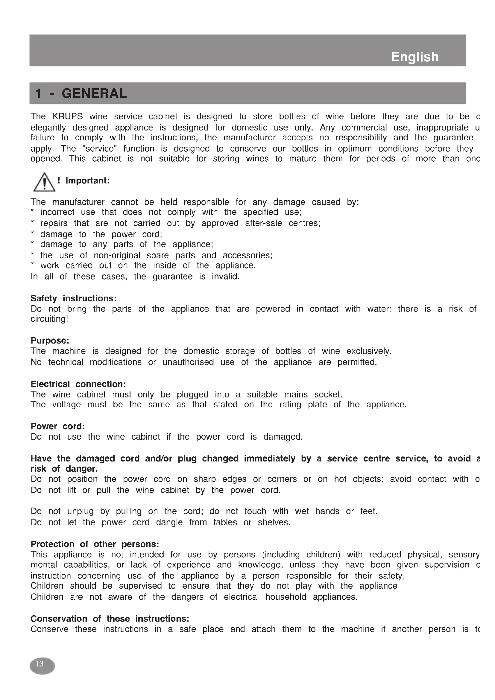 - work carried out on the inside of the appliance. In all of these cases, the guarantee is invalid. Safety instructions: Do not bring the parts of the appliance that are powered in contact with water: there is a risk of short- circuiting! Purpose: The machine is designed for the domestic storage of bottles of wine exclusively. No technical modifications or unauthorised use of the appliance are permitted. Electrical connection: The wine cabinet must only be plugged into a suitable mains socket. The voltage must be the same as that stated on the rating plate of the appliance. Power cord: Do not use the wine cabinet if the power cord is damaged. Have the damaged cord and/or plug changed immediately by a service centre service, to avoid any risk of danger. Do not position the power cord on sharp edges or corners or on hot objects; avoid contact with oil. Do not lift or pull the wine cabinet by the power cord. Do not unplug by pulling on the cord; do not touch with wet hands or feet. Do not let the power cord dangle from tables or shelves. Protection of other persons: This appliance is not intended for use by persons (including children) with reduced physical, sensory or mental capabilities, or lack of experience and knowledge, unless they have been given supervision or instruction concerning use of the appliance by a person responsible for their safety. Children should be supervised to ensure that they do not play with the appliance Children are not aware of the dangers of electrical household appliances. Conservation of these instructions: Conserve these instructions in a safe place and attach them to the machine if another person is to use it.