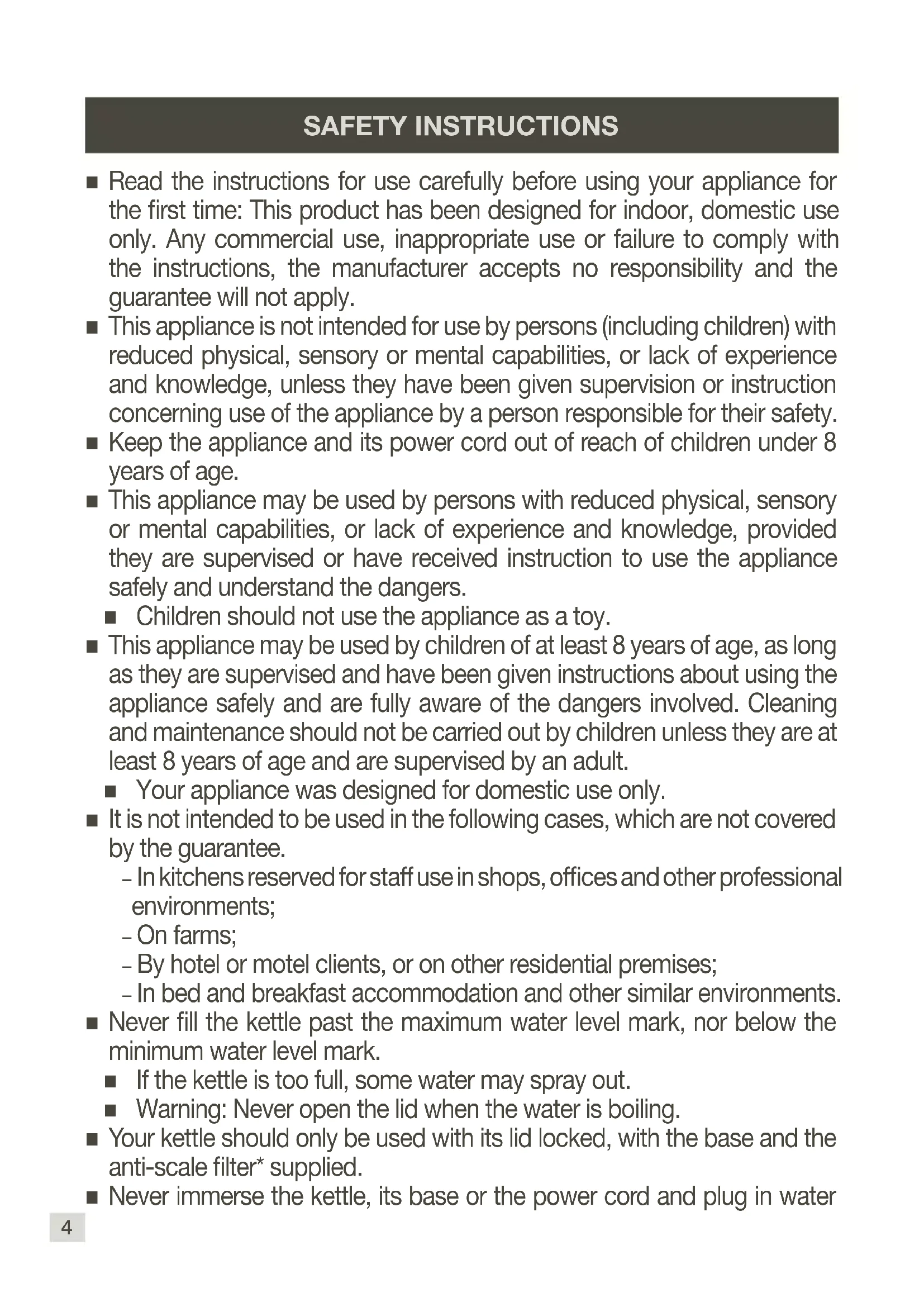 SAFETY INSTRUCTIONS Read the instructions for use carefully before using your appliance for the rst time: This product has been designed for indoor, domestic use only. Any commercial use, inappropriate use or failure to comply with the instructions, the manufacturer accepts no responsibility and the guarantee will not apply. This appliance is not intended for use by persons (including children) with reduced physical, sensory or mental capabilities, or lack of experience and knowledge, unless they have been given supervision or instruction concerning use of the appliance by a person responsible for their safety. Keep the appliance and its power cord out of reach of children under 8 years of age. This appliance may be used by persons with reduced physical, sensory or mental capabilities, or lack of experience and knowledge, provided they are supervised or have received instruction to use the appliance safely and understand the dangers. Children should not use the appliance as a toy. This appliance may be used by children of at least 8 years of age, as long as they are supervised and have been given instructions about using the appliance safely and are fully aware of the dangers involved. Cleaning and maintenance should not be carried out by children unless they are at least 8 years of age and are supervised by an adult. Your appliance was designed for domestic use only. It is not intended to be used in the following cases, which are not covered by the guarantee. – In kitchens reserved for staff use in shops, ofces and other professional environments; – On farms; – By hotel or motel clients, or on other residential premises; – In bed and breakfast accommodation and other similar environments. Never ll the kettle past the maximum water level mark, nor below the minimum water level mark. If the kettle is too full, some water may spray out.
