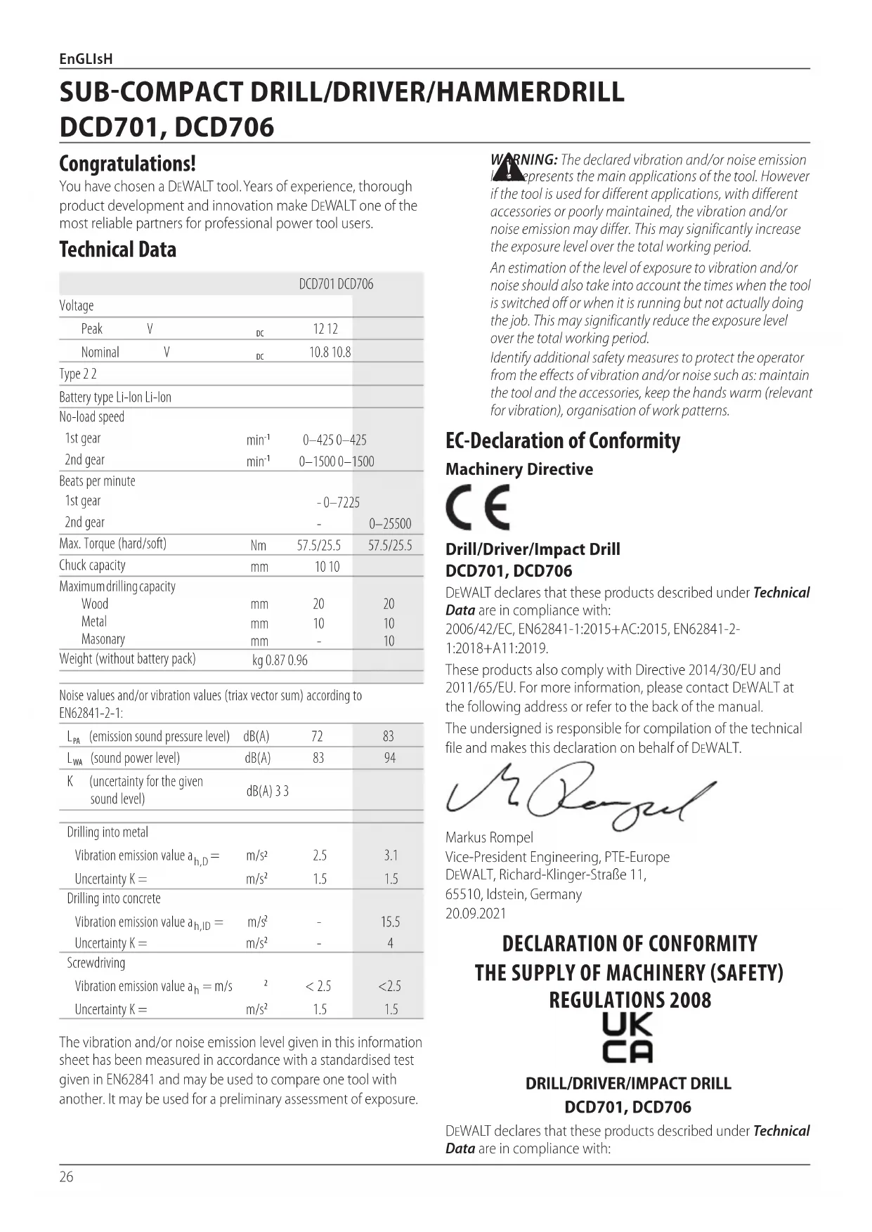 DCD701, DCD706 DeWALT declares that these products described under Technical Data are in compliancewith: