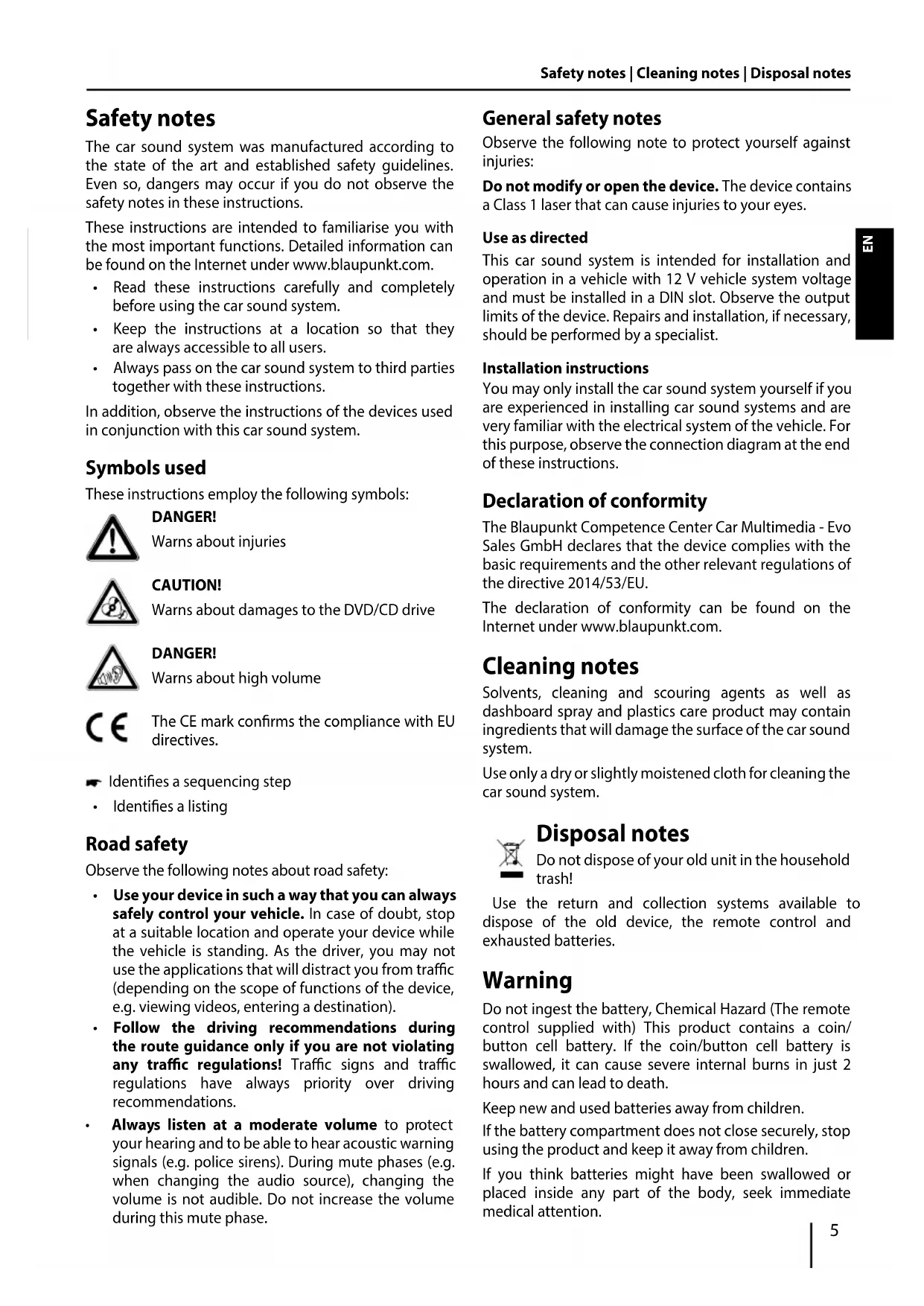 - Always listen at a moderate volume to protect your hearing and to be able to hear acoustic warning signals (e.g. police sirens). During mute phases (e.g. when changing the audio source), changing the volume is not audible. Do not increase the volume during this mute phase. General safety notes Observe the following note to protect yourself against injuries: Do not modify or open the device. The device contains a Class 1 laser that can cause injuries to your eyes. Use as directed This car sound system is intended for installation and operation in a vehicle with 12 V vehicle system voltage and must be installed in a DIN slot. Observe the output limits of the device. Repairs and installation, if necessary, should be performed by a specialist. Installation instructions You may only install the car sound system yourself if you are experienced in installing car sound systems and are very familiar with the electrical system of the vehicle. For this purpose, observe the connection diagram at the end of these instructions. Declaration of conformity The Blaupunkt Competence Center Car Multimedia - Evo Sales GmbH declares that the device complies with the basic requirements and the other relevant regulations of the directive 2014/53/EU. The declaration of conformity can be found on the Internet under www.blaupunkt.com. Cleaning notes Solvents, cleaning and scouring agents as well as dashboard spray and plastics care product may contain ingredients that will damage the surface of the car sound system. Use only a dry or slightly moistened cloth for cleaning the car sound system. Disposal notes Do not dispose of your old unit in the household trash! Use the return and collection systems available to dispose of the old device, the remote control and exhausted batteries. Warning Do not ingest the battery, Chemical Hazard (The remote control supplied with) This product contains a coin/ button cell battery. If the coin/button cell battery is swallowed, it can cause severe internal burns in just 2 hours and can lead to death. Keep new and used batteries away from children. If the battery compartment does not close securely, stop using the product and keep it away from children. If you think batteries might have been swallowed or placed inside any part of the body, seek immediate medical attention.6 Scope of delivery The scope of delivery includes: