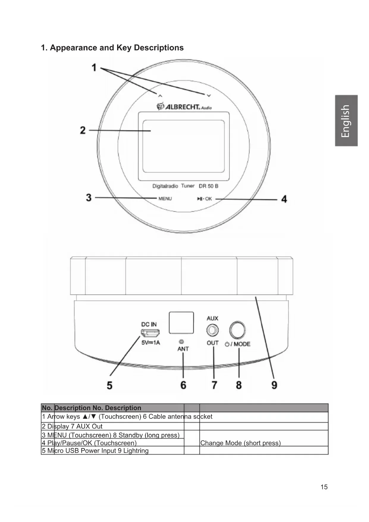 Conrm your selection Numbers 1-10 Save / recall favorites 1-10 SCAN Scan for available stations MENU Open main MENU for settings Lightring control (see chapter „9.2.1. Lichtring“) PAIR Connect the Albrecht DR50B with Bluetooth device INFO Information about the currently played song