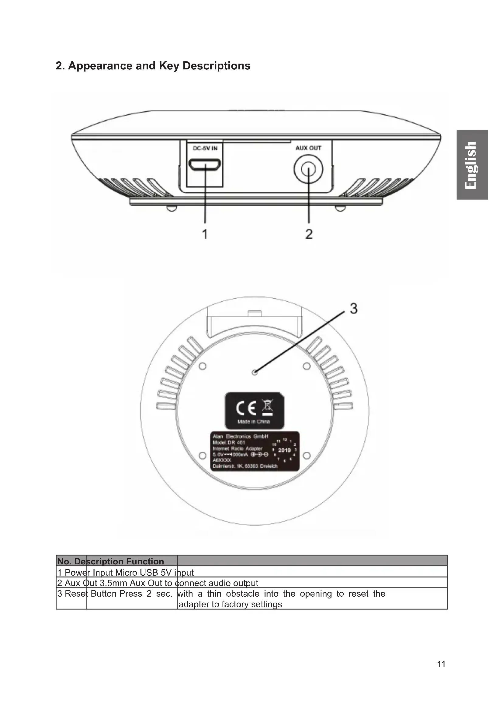 No. Description Function 1 Power Input Micro USB 5V input 2 Aux Out 3.5mm Aux Out to connect audio output 3 Reset Button Press 2 sec. with a thin obstacle into the opening to reset the adapter to factory settings12 English