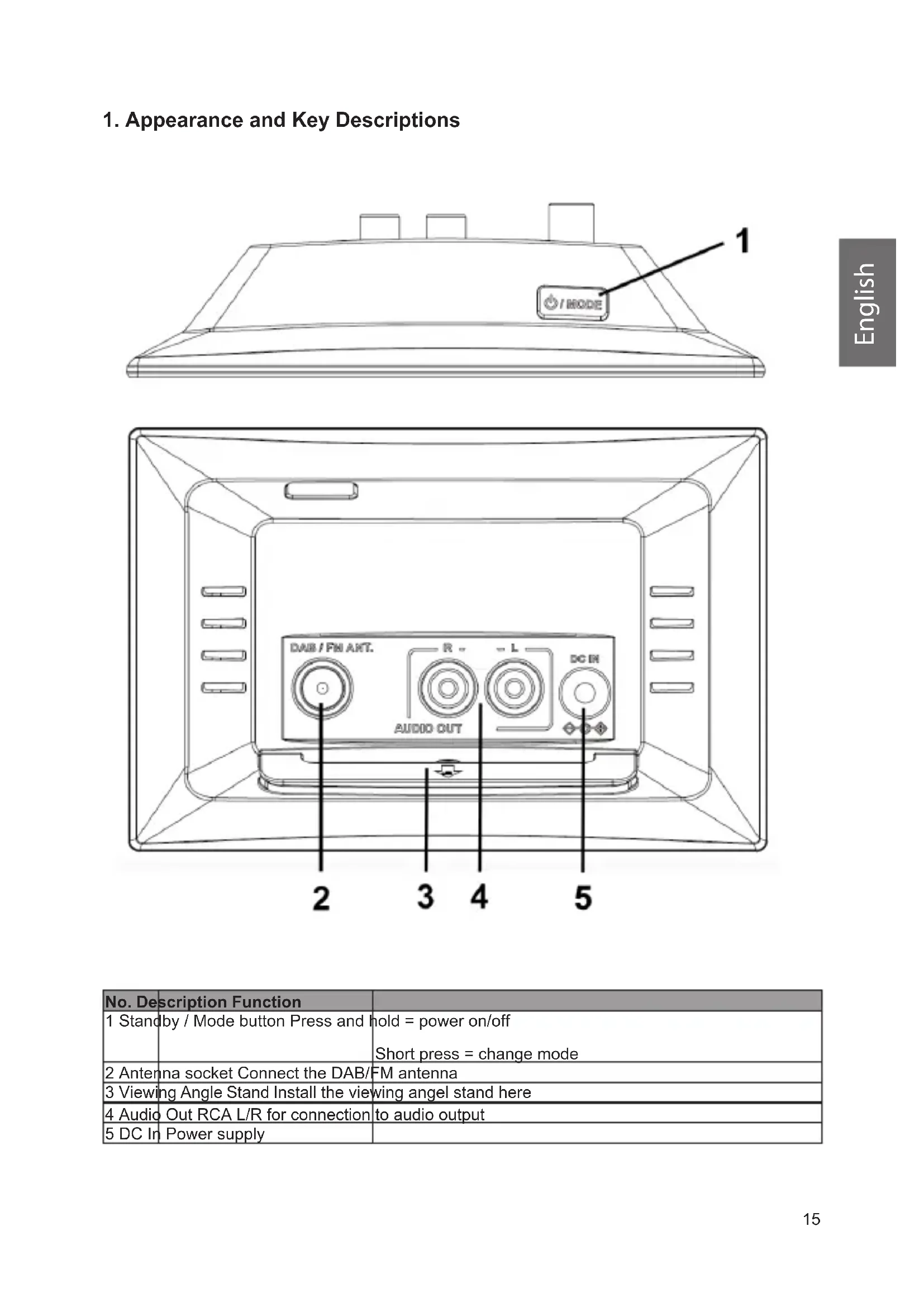 | 1 Standby / Mode button Press and hold = power on/off | |