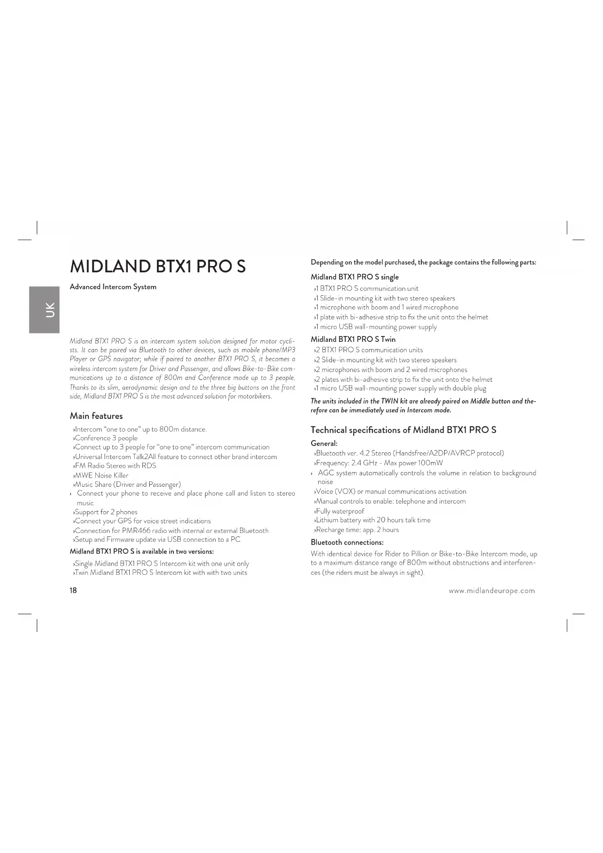 Advanced Intercom System Midland BTX1 PRO S is an intercom system solution designed for motor cycli- sts. It can be paired via Bluetooth to other devices, such as mobile phone/MP3 Player or GPS navigator; while if paired to another BTX1 PRO S, it becomes a wireless intercom system for Driver and Passenger, and allows Bike-to-Bike com- munications up to a distance of 800m and Conference mode up to 3 people. Thanks to its slim, aerodynamic design and to the three big buttons on the front side, Midland BTX1 PRO S is the most advanced solution for motorbikers. Main features › Intercom “one to one” up to 800m distance. › Conference 3 people › Connect up to 3 people for “one to one” intercom communication › Universal Intercom Talk2All feature to connect other brand intercom › FM Radio Stereo with RDS › MWE Noise Killer › Music Share (Driver and Passenger) › Connect your phone to receive and place phone call and listen to stereo music › Support for 2 phones › Connect your GPS for voice street indications › Connection for PMR466 radio with internal or external Bluetooth › Setup and Firmware update via USB connection to a PC Midland BTX1 PRO S is available in two versions: › Single Midland BTX1 PRO S Intercom kit with one unit only › Twin Midland BTX1 PRO S Intercom kit with with two units Depending on the model purchased, the package contains the following parts: Midland BTX1 PRO S single › 1 BTX1 PRO S communication unit › 1 Slide-in mounting kit with two stereo speakers › 1 microphone with boom and 1 wired microphone › 1 plate with bi-adhesive strip to fix the unit onto the helmet › 1 micro USB wall-mounting power supply Midland BTX1 PRO S Twin › 2 BTX1 PRO S communication units › 2 Slide-in mounting kit with two stereo speakers › 2 microphones with boom and 2 wired microphones › 2 plates with bi-adhesive strip to fix the unit onto the helmet › 1 micro USB wall-mounting power supply with double plug The units included in the TWIN kit are already paired on Middle button and the- refore can be immediately used in Intercom mode. Technical specifications of Midland BTX1 PRO S General: › Bluetooth ver. 4.2 Stereo (Handsfree/A2DP/AVRCP protocol) › Frequency: 2.4 GHz - Max power 100mW › AGC system automatically controls the volume in relation to background noise › Voice (VOX) or manual communications activation › Manual controls to enable: telephone and intercom › Fully waterproof › Lithium battery with 20 hours talk time › Recharge time: app. 2 hours Bluetooth connections: With identical device for Rider to Pillion or Bike-to-Bike Intercom mode, up to a maximum distance range of 800m without obstructions and interferen- ces (the riders must be always in sight).UK www.midlandeurope.com 19 Bluetooth devices: › Mobile phone with MP3 player Stereo (A2DP protocol) and GPS navigator › PMR446 transceivers (with built-in or external Bluetooth connection) for group bike-to-bike communications. Attention: Midland BTX1 PRO S is designed to withstand rain and water. Howe- ver, if it is raining, always verify that the rubber cap protecting the recharging sockets is fully fitted. Charging batteries Attention: Make sure that the unit is fully charged before use. Allow at least 3 hours for a full charge before using the unit for the first time. Charge the unit by inserting the wall-charger into the charging socket (lift the rubber cover to insert the plug). The red LED on the unit will start flashing when charging begins. Allow the headset to charge until the unit stops flashing or the blue LED turns on. When the charge is complete (the red LED is not flashing), release the he- adset from the charger. Normally, after the first time, it takes 2 hours for a full charge. Attention: every time the micro USB recharging plug is inserted (or detached), the device is automatically turned o. To use it while it is in charge, you should turn the device on with the plug already inserted. Unit and fixing system description BTX1 PRO S description The BTX1 PRO S has five buttons on the front; the main three big buttons are multi functions buttons: the Forward (on the left), the middle button and the Backward (on the right), the two squared buttons are the Volume + and Volume -. Description of the wired connections On the bottom of the unit you can find the Charger jack that enables to re- charge the unit using a standard microUSB power supply Description of the audio kit The audio system includes two HI-FI stereo speakers and two interchangeable microphones, which are both supplied with a bracket and wired connection. The mini connector on the microphone allows you to choose the microphone that best suits the helmet you are using. LED Middle Volume - Volume + Forward BackwardCharger plugUK 20 www.midlandeurope.com Fixing the stereo speakers The two stereo speakers have a Velcro/adhesive strip that aids their fixing into your helmet. Beware not to keep the volume too high, you must always be able to listen to the trac sound. Fixing the microphone Boom Microphone Place the section with the Velcro/adhesive strip between the padding and the rigid cover of the helmet, so that the microphone is correctly positioned in front of your mouth and that the white symbol is facing your mouth. This type of microphone is suited for Open Faced and Flip Front helmets. For open helmets it is also available a specific optional microphone cod. C1253. Wired microphone Using the Velcro/adhesive strip, place the microphone inside the helmet in front of your mouth. This type of microphone is more suited for Full Faced helmets. The mini connector on the microphone allows you choose the mi- crophone that best suits the helmet you are using. Description of the Slide-in mounting kit To fix the Midland BTX1 PRO S onto the helmet, you have to install the sli- de-in mounting kit by using the plate with bi-adhesive strip. This method al- lows you to safely “fix” the BTX1 PRO S unit o