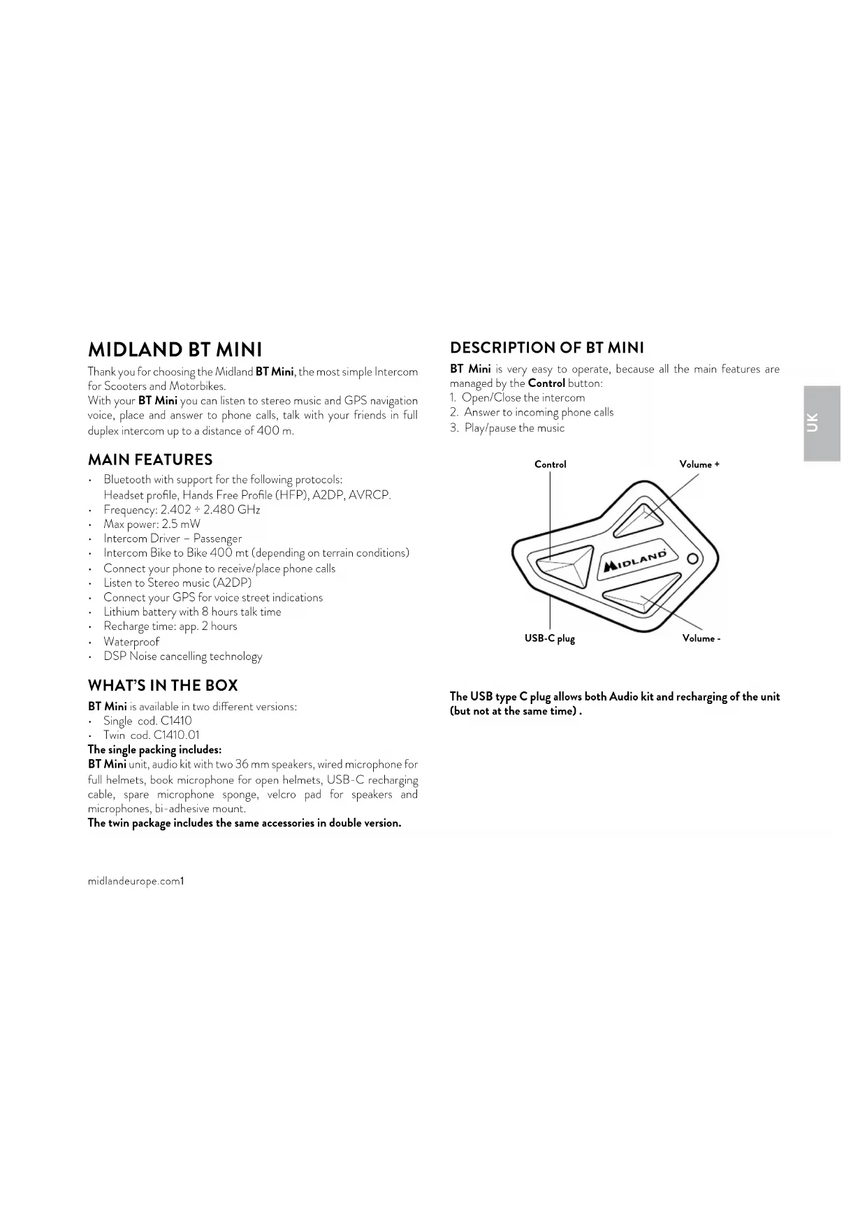 Midland BT Mini is a full duplex intercom communication system Driver to Passenger and Bike to Bike communication up to a maximum distance of 400 mt. (depending on terrain conditions). In addition you can listen to Stereo music, place and answer to phone calls or receive voice street indications from the GPS. If you receive a phone call during an intercom communication, the intercom is closed and reopens as soon as the phone call is over. If the intercom communication is open while you are listening to music, the music will be paused. When the intercom is closed, the music is automatically resumed. If you receive a phone call while you are listening to music, the music will be paused. When the phone call is closed, the music is automatically resumed. ATTENTION: Midland BT Mini automatically answers to an incoming phone call after 8 sec. You can disable this feature and manually answer to the incoming calls. Enable auto answer Vol+ and Vol- for 5 sec. Voice: “Enable” Disable auto answer Vol+ and Vol- for 5 sec. Voice: “Disable” Basic Functionalities Turn ON Press 1 sec. on Control and Vol- buttons Voice prompt: “Power on” and “Battery status” Turn OFF Press 1 sec. on Control and Vol- buttons Voice prompt: “Power o” Volume adjustment Short press on Vol+ or Vol- or keep pressed Pairing to a phone/GPS Start pairing on BT Mini Unit is o: Control for 5 sec Red and blue LED blink alternately Voice: “Pairing” when starts, “Pairing successful” when finished Start pairing on Bluetooth devices (phone/GPS/MP3) Searches for Bluetooth device from the phone or GPS and select “Midland BT Mini” from the list PIN (if requested) “0000” How to use a phone Answer call Short press on Control button during incoming call End call Short press on Control Reject call Control for 3 sec when ringing Voice dial Double click on Control button or Vol+UK midlandeurope.com4 Redial Double click on Vol- button (voice: “Redial”) Cancel redial Short press on Control Auto answer feature By default the “Auto answer” is active, that means the BT Mini will automatically answer to an incoming call after 8 sec. How to use a music player Play/Pause music Press 3 sec on Control button FWD song Vol+ double click BWD song Vol- double clilck Pairing to another BT Mini Unit Start pairing on both BT Mini units Unit is in stand by mode, press Vol- for 5 sec on both units, red and blue LED blink alternately Voice prompt: “Pairing successful” when finished How to use the intercom Open/Close intercom Short press on Control button Pairing to another Intercom It is possible to pair the BT Mini to another model/brand intercom, only if the other unit supports the Universal Intercom feature. The BT Mini will use the phone pairing to connect to the Universal Intercom of the other unit. Start pairing on BT Mini Unit Unit is power o Control for 5 sec Red and blue LED blink alternate Start pairing on other Intercom Follow the manual for “Universal intercom pairing” on the other unit How to use the Universal Intercom Open/Close Universal Intercom Control double click/Control short press Attention: you need to repeat twice the Open command: after you hear the voice “Device connected”, double click Control again. Special Action Reset all pairing Unit is power o: Vol- and Control for 7 sec (LED full blue for 3 sec) Cancel Pairing When pairing is in progress, double click on Vol+ , Vol- or Control Enable auto answer Vol+ and Vol- for 5 sec (voice “Enable”) Disable auto answer Vol+ and Vol- for 5 sec (voice “Diseable”)UK midlandeurope.com 5 Voice prompt/Beep/Light