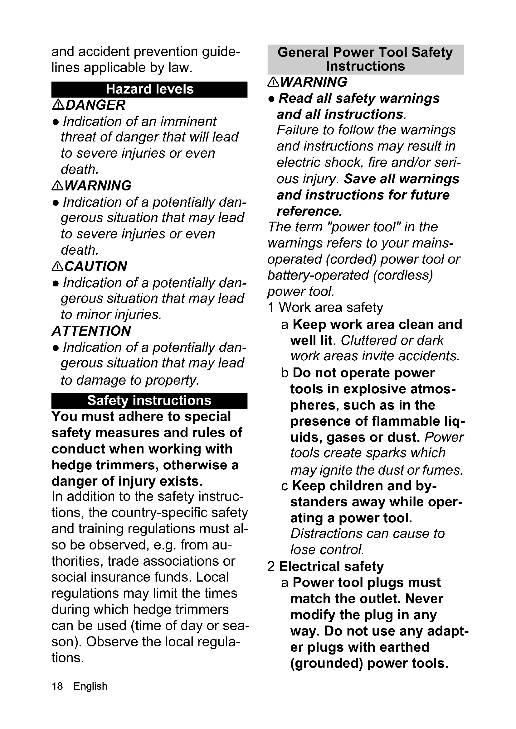 - EU Declaration of Conformity Chairman of the Board of ManagementDirector Regulatory Affairs & Certification H. Jenner S. Reiser18 English and accident prevention guide- lines applicable by law. Hazard levels DANGER ● Indication of an imminent threat of danger that will lead to severe injuries or even death. 몇 WARNING ● Indication of a potentially dan- gerous situation that may lead to severe injuries or even death. 몇 CAUTION ● Indication of a potentially dan- gerous situation that may lead to minor injuries. ATTENTION ● Indication of a potentially dan- gerous situation that may lead to damage to property. Safety instructions You must adhere to special safety measures and rules of conduct when working with hedge trimmers, otherwise a danger of injury exists. In addition to the safety instruc- tions, the country-specific safety and training regulations must al- so be observed, e.g. from au- thorities, trade associations or social insurance funds. Local regulations may limit the times during which hedge trimmers can be used (time of day or sea- son). Observe the local regula- tions. General Power Tool Safety Instructions 몇 WARNING ● Read all safety warnings and all instructions. Failure to follow the warnings and instructions may result in electric shock, fire and/or seri- ous injury. Save all warnings and instructions for future reference. The term "power tool" in the warnings refers to your mains- operated (corded) power tool or battery-operated (cordless) power tool. 1 Work area safety a Keep work area clean and well lit. Cluttered or dark work areas invite accidents. b Do not operate power tools in explosive atmos- pheres, such as in the presence of flammable liq- uids, gases or dust. Power tools create sparks which may ignite the dust or fumes. c Keep children and by- standers away while oper- ating a power tool. Distractions can cause to lose control. 2 Electrical safety a Power tool plugs must match the outlet. Never modify the plug in any way. Do not use any adapt- er plugs with earthed (grounded) power tools.English 19 Unmodified plugs and matching outlets will reduce the risk of electric shock. b Avoid body contact with earthed or grounded sur- faces such as pipes, radia- tors, ranges and refrigerators. There is an increased risk of electric shock if your body is earthed or grounded. c Do not expose power tools to rain or wet conditions. Water entering a power tool will increase the risk of elec- tric shock. d Do not abuse the cord. Never use the cord for car- rying, pulling or unplug- ging the power tool. Keep cord away from heat, oil, sharp edges or moving parts. Damaged or entan- gled cords increase the risk of electric shock. e When operating a power tool outdoors, use an ex- tension cord suitable for outdoor use. Using of a cord suitable for outdoor use reduces the risk of electric shock. f If operating a power tool in a damp location is una- voidable, use a residual current device (RCD) pro- tected supply. Use of an RCD reduces the risk of electric shock. 3 Personal safety a Stay alert, watch what you are doing and use com- mon sense when operat- ing a power tool. Do not use a power tool while you are tired or under the influ- ence of drugs, alcohol or medication. A moment of inattention while operating power tools may result in se- rious personal injury. b Use personal protective equipment. Always wear eye protection. Protective equipment such as dust mask, non-skid safety shoes, hard hat, or hearing protection used for appropri- ate conditions will reduce personal injuries. c Prevent unintentional starting. Ensure the switch is in the off-posi- tion before connecting to power source and/or bat- tery pack, picking up or carrying the tool. Carrying power tools with your finger on the switch or energising power tools that have the switch on invites accidents. d Remove any adjusting key or wrench before turning the power tool on. A wrench or a key left attached to a rotating part of the pow- er tool may result in personal injury.20 English e Do not overreach. Keep proper footing and bal- ance at all times. This ena- bles better control of the power tool in unexpected sit- uations. f Dress properly. Do not wear loose clothing or jewellery. Keep your hair, clothing and gloves away from moving parts. Loose clothes, jewellery or long hair can be caught in moving parts. g If devices are provided for the connection of dust ex- traction and collection fa- cilities, ensure these are connected and properly used. Use of dust collection can reduce dust-related haz- ards. 4 Power tool use and care a Do not force the power tool. Use the correct pow- er tool for your applica- tion. The correct power tool will do the job better and saf- er at the rate for which it was designed. b Do not use the power tool if the switch does not turn it on and off. Any power tool that cannot be controlled with the switch is dangerous and must be repaired. c Disconnect the plug from the power source and/or the battery pack from the power tool before making any adjustments, chang- ing accessories, or storing power tools. Such preven- tive safety measures reduce the risk of starting the power tool accidentally. d Store idle power tools out of the reach of children and do not allow persons unfamiliar with the power tool or these instructions to operate the power tool. Power tools are dangerous in the hands of untrained us- ers. e Maintain power tools. Check for misalignment or binding of moving parts, breakage of parts and any other condition that may affect the power tool’s op- eration. If damaged, have the power tool repaired before use. Many accidents are caused by poorly main- tained power tools. f Keep cutting tools sharp and clean. Properly main- tained cutting tools with sharp cutting edges are less likely to bind and are easier to control. g Use the power tool, acces- sories and tool bits etc. in accordance with these in- structions, taking into ac- count the working conditions and the