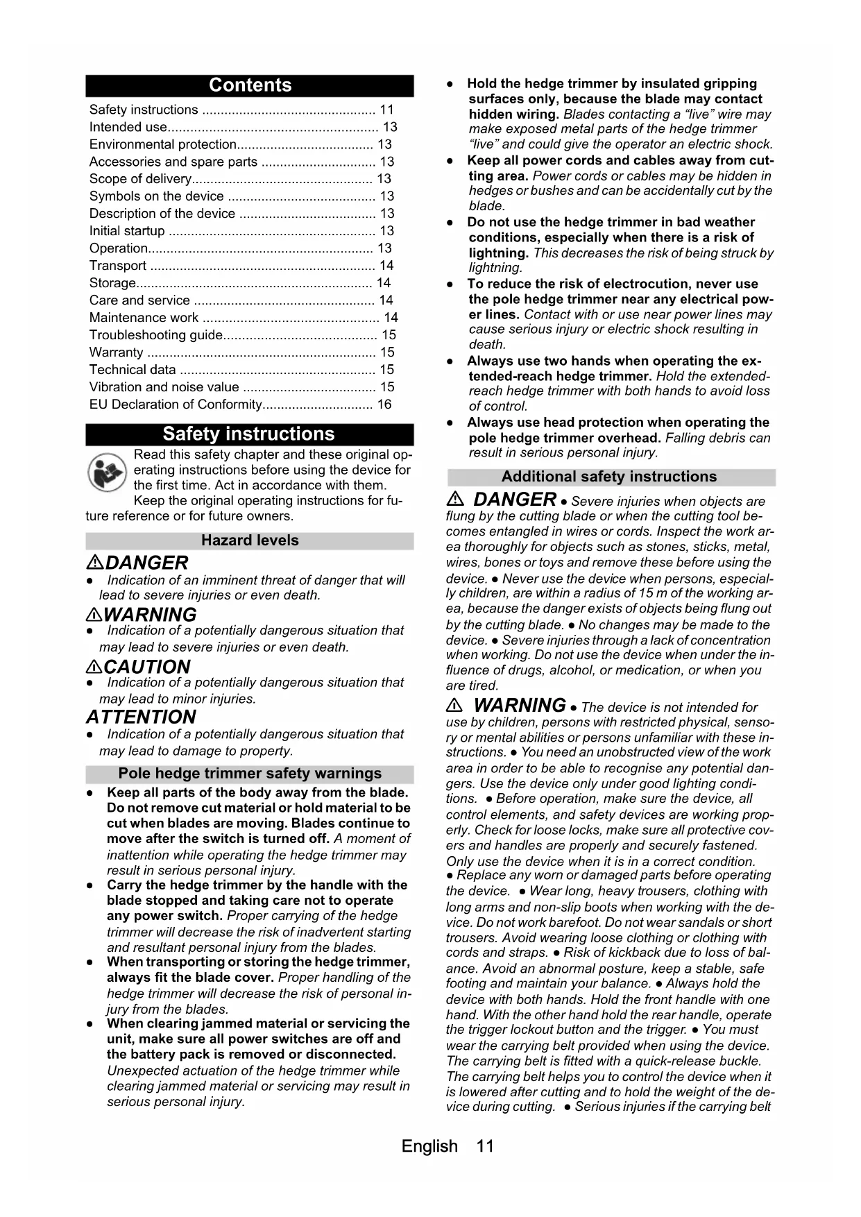- 1,5English 11 Contents Safety instructions Read this safety chapter and these original op- erating instructions before using the device for the first time. Act in accordance with them. Keep the original operating instructions for fu- ture reference or for future owners. Hazard levels DANGER ● Indication of an imminent threat of danger that will lead to severe injuries or even death. 몇 WARNING ● Indication of a potentially dangerous situation that may lead to severe injuries or even death. 몇 CAUTION ● Indication of a potentially dangerous situation that may lead to minor injuries. ATTENTION ● Indication of a potentially dangerous situation that may lead to damage to property. Pole hedge trimmer safety warnings ● Keep all parts of the body away from the blade. Do not remove cut material or hold material to be cut when blades are moving. Blades continue to move after the switch is turned off. A moment of inattention while operating the hedge trimmer may result in serious personal injury. ● Carry the hedge trimmer by the handle with the blade stopped and taking care not to operate any power switch. Proper carrying of the hedge trimmer will decrease the risk of inadvertent starting and resultant personal injury from the blades. ● When transporting or storing the hedge trimmer, always fit the blade cover. Proper handling of the hedge trimmer will decrease the risk of personal in- jury from the blades. ● When clearing jammed material or servicing the unit, make sure all power switches are off and the battery pack is removed or disconnected. Unexpected actuation of the hedge trimmer while clearing jammed material or servicing may result in serious personal injury. ● Hold the hedge trimmer by insulated gripping surfaces only, because the blade may contact hidden wiring. Blades contacting a “live” wire may make exposed metal parts of the hedge trimmer “live” and could give the operator an electric shock. ● Keep all power cords and cables away from cut- ting area. Power cords or cables may be hidden in hedges or bushes and can be accidentally cut by the blade. ● Do not use the hedge trimmer in bad weather conditions, especially when there is a risk of lightning. This decreases the risk of being struck by lightning. ● To reduce the risk of electrocution, never use the pole hedge trimmer near any electrical pow- er lines. Contact with or use near power lines may cause serious injury or electric shock resulting in death. ● Always use two hands when operating the ex- tended-reach hedge trimmer. Hold the extended- reach hedge trimmer with both hands to avoid loss of control. ● Always use head protection when operating the pole hedge trimmer overhead. Falling debris can result in serious personal injury. Additional safety instructions DANGER ● Severe injuries when objects are flung by the cutting blade or when the cutting tool be- comes entangled in wires or cords. Inspect the work ar- ea thoroughly for objects such as stones, sticks, metal, wires, bones or toys and remove these before using the device. ● Never use the device when persons, especial- ly children, are within a radius of 15 m of the working ar- ea, because the danger exists of objects being flung out by the cutting blade. ● No changes may be made to the device. ● Severe injuries through a lack of concentration when working. Do not use the device when under the in- fluence of drugs, alcohol, or medication, or when you are tired. 몇 WARNING ● The device is not intended for use by children, persons with restricted physical, senso- ry or mental abilities or persons unfamiliar with these in- structions. ● You need an unobstructed view of the work area in order to be able to recognise any potential dan- gers. Use the device only under good lighting condi- tions. ● Before operation, make sure the device, all control elements, and safety devices are working prop- erly. Check for loose locks, make sure all protective cov- ers and handles are properly and securely fastened. Only use the device when it is in a correct condition. ● Replace any worn or damaged parts before operating the device. ● Wear long, heavy trousers, clothing with long arms and non-slip boots when working with the de- vice. Do not work barefoot. Do not wear sandals or short trousers. Avoid wearing loose clothing or clothing with cords and straps. ● Risk of kickback due to loss of bal- ance. Avoid an abnormal posture, keep a stable, safe footing and maintain your balance. ● Always hold the device with both hands. Hold the front handle with one hand. With the other hand hold the rear handle, operate the trigger lockout button and the trigger. ● You must wear the carrying belt provided when using the device. The carrying belt is fitted with a quick-release buckle. The carrying belt helps you to control the device when it is lowered after cutting and to hold the weight of the de- vice during cutting. ● Serious injuries if the carrying belt Safety instructions p. 11
