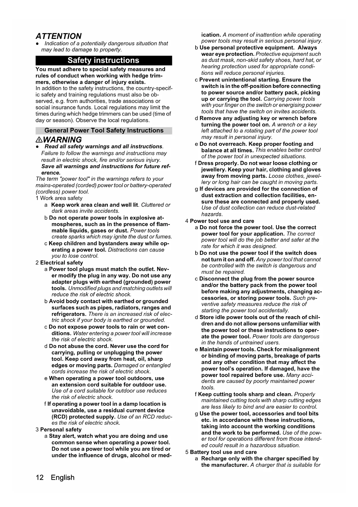 - Declaration of Conformity English ATTENTION ● Indication of a potentially dangerous situation that may lead to damage to property. Safety instructions You must adhere to special safety measures and rules of conduct when working with hedge trim- mers, otherwise a danger of injury exists. In addition to the safety instructions, the country-specif- ic safety and training regulations must also be ob- served, e.g. from authorities, trade associations or social insurance funds. Local regulations may limit the times during which hedge trimmers can be used (time of day or season). Observe the local regulations. General Power Tool Safety Instructions 몇 WARNING ● Read all safety warnings and all instructions. Failure to follow the warnings and instructions may result in electric shock, fire and/or serious injury. Save all warnings and instructions for future ref- erence. The term "power tool" in the warnings refers to your mains-operated (corded) power tool or battery-operated (cordless) power tool. 1 Work area safety a Keep work area clean and well lit. Cluttered or dark areas invite accidents. b Do not operate power tools in explosive at- mospheres, such as in the presence of flam- mable liquids, gases or dust. Power tools create sparks which may ignite the dust or fumes. c Keep children and bystanders away while op- erating a power tool. Distractions can cause you to lose control. 2 Electrical safety a Power tool plugs must match the outlet. Nev- er modify the plug in any way. Do not use any adapter plugs with earthed (grounded) power tools. Unmodified plugs and matching outlets will reduce the risk of electric shock. b Avoid body contact with earthed or grounded surfaces such as pipes, radiators, ranges and refrigerators. There is an increased risk of elec- tric shock if your body is earthed or grounded. c Do not expose power tools to rain or wet con- ditions. Water entering a power tool will increase the risk of electric shock. d Do not abuse the cord. Never use the cord for carrying, pulling or unplugging the power tool. Keep cord away from heat, oil, sharp edges or moving parts. Damaged or entangled cords increase the risk of electric shock. e When operating a power tool outdoors, use an extension cord suitable for outdoor use. Use of a cord suitable for outdoor use reduces the risk of electric shock. f If operating a power tool in a damp location is unavoidable, use a residual current device (RCD) protected supply. Use of an RCD reduc- es the risk of electric shock. 3 Personal safety a Stay alert, watch what you are doing and use common sense when operating a power tool. Do not use a power tool while you are tired or under the influence of drugs, alcohol or med- ication. A moment of inattention while operating power tools may result in serious personal injury. b Use personal protective equipment. Always wear eye protection. Protective equipment such as dust mask, non-skid safety shoes, hard hat, or hearing protection used for appropriate condi- tions will reduce personal injuries. c Prevent unintentional starting. Ensure the switch is in the off-position before connecting to power source and/or battery pack, picking up or carrying the tool. Carrying power tools with your finger on the switch or energising power tools that have the switch on invites accidents. d Remove any adjusting key or wrench before turning the power tool on. A wrench or a key left attached to a rotating part of the power tool may result in personal injury. e Do not overreach. Keep proper footing and balance at all times. This enables better control of t he power tool in unexpected situations. f Dress properly. Do not wear loose clothing or jewellery. Keep your hair, clothing and gloves away from moving parts. Loose clothes, jewel- lery or long hair can be caught in moving parts. g If devices are provided for the connection of dust extraction and collection facilities, en- sure these are connected and properly used. Use of dust collection can reduce dust-related hazards. 4 Power tool use and care a Do not force the power tool. Use the correct power tool for your application. The correct power tool will do the job better and safer at the rate for which it was designed. b Do not use the power tool if the switch does not turn it on and off. Any power tool that cannot be controlled with the switch is dangerous and must be repaired. c Disconnect the plug from the power source and/or the battery pack from the power tool before making any adjustments, changing ac- cessories, or storing power tools. Such pre- ventive safety measures reduce the risk of starting the power tool accidentally. d Store idle power tools out of the reach of chil- dren and do not allow persons unfamiliar with the power tool or these instructions to oper- ate the power tool. Power tools are dangerous in the hands of untrained users. e Maintain power tools. Check for misalignment or binding of moving parts, breakage of parts and any other condition that may affect the power tool’s operation. If damaged, have the power tool repaired before use. Many acci- dents are caused by poorly maintained power tools. f Keep cutting tools sharp and clean. Properly maintained cutting tools with sharp cutting edges are less likely to bind and are easier to control. g Use the power tool, accessories and tool bits etc. in accordance with these instructions, taking into account the working conditions and the work to be performed. Use of the pow- er tool for operations different from those intend- ed could result in a hazardous situation. 5 Battery tool use and care a Recharge only with the charger specified by the manufacturer. A charger that is suitable forEnglish 13 one type of battery pack may create a risk of fire when used with another battery pack. b Use power tools only with specifically desig- nated battery packs. Use of any other battery packs may create a risk of injury and fire. c When battery pack is not in use, keep it away from other metal objects, l