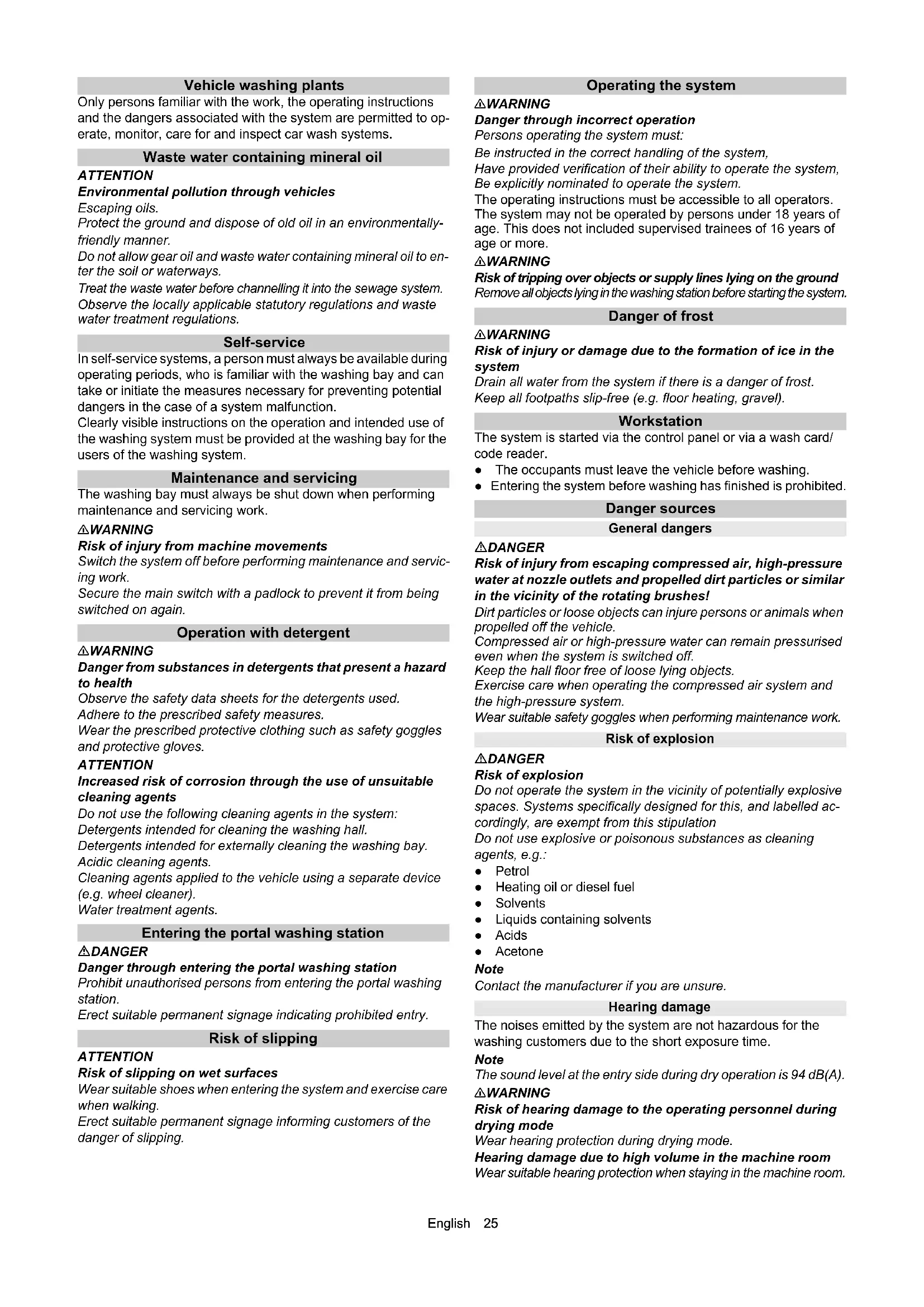 • Declaration of Conformity English 25 Vehicle washing plants Only persons familiar with the work, the operating instructions and the dangers associated with the system are permitted to op- erate, monitor, care for and inspect car wash systems. Waste water containing mineral oil ATTENTION Environmental pollution through vehicles Escaping oils. Protect the ground and dispose of old oil in an environmentally- friendly manner. Do not allow gear oil and waste water containing mineral oil to en- ter the soil or waterways. Treat the waste water before channelling it into the sewage system. Observe the locally applicable statutory regulations and waste water treatment regulations. Self-service In self-service systems, a person must always be available during operating periods, who is familiar with the washing bay and can take or initiate the measures necessary for preventing potential dangers in the case of a system malfunction. Clearly visible instructions on the operation and intended use of the washing system must be provided at the washing bay for the users of the washing system. Maintenance and servicing The washing bay must always be shut down when performing maintenance and servicing work. 몇 WARNING Risk of injury from machine movements Switch the system off before performing maintenance and servic- ing work. Secure the main switch with a padlock to prevent it from being switched on again. Operation with detergent 몇 WARNING Danger from substances in detergents that present a hazard to health Observe the safety data sheets for the detergents used. Adhere to the prescribed safety measures. Wear the prescribed protective clothing such as safety goggles and protective gloves. ATTENTION Increased risk of corrosion through the use of unsuitable cleaning agents Do not use the following cleaning agents in the system: Detergents intended for cleaning the washing hall. Detergents intended for externally cleaning the washing bay. Acidic cleaning agents. Cleaning agents applied to the vehicle using a separate device (e.g. wheel cleaner). Water treatment agents. Entering the portal washing station DANGER Danger through entering the portal washing station Prohibit unauthorised persons from entering the portal washing station. Erect suitable permanent signage indicating prohibited entry. Risk of slipping ATTENTION Risk of slipping on wet surfaces Wear suitable shoes when entering the system and exercise care when walking. Erect suitable permanent signage informing customers of the danger of slipping. Operating the system 몇 WARNING Danger through incorrect operation Persons operating the system must: Be instructed in the correct handling of the system, Have provided verification of their ability to operate the system, Be explicitly nominated to operate the system. The operating instructions must be accessible to all operators. The system may not be operated by persons under 18 years of age. This does not included supervised trainees of 16 years of age or more. 몇 WARNING Risk of tripping over objects or supply lines lying on the ground Remove all objects lying in the washing station before starting the system. Danger of frost 몇 WARNING Risk of injury or damage due to the formation of ice in the system Drain all water from the system if there is a danger of frost. Keep all footpaths slip-free (e.g. floor heating, gravel). Workstation The system is started via the control panel or via a wash card/ code reader. ● The occupants must leave the vehicle before washing. ● Entering the system before washing has finished is prohibited. Danger sources General dangers DANGER Risk of injury from escaping compressed air, high-pressure water at nozzle outlets and propelled dirt particles or similar in the vicinity of the rotating brushes! Dirt particles or loose objects can injure persons or animals when propelled off the vehicle. Compressed air or high-pressure water can remain pressurised even when the system is switched off. Keep the hall floor free of loose lying objects. Exercise care when operating the compressed air system and the high-pressure system. Wear suitable safety goggles when performing maintenance work. Risk of explosion DANGER Risk of explosion Do not operate the system in the vicinity of potentially explosive spaces. Systems specifically designed for this, and labelled ac- cordingly, are exempt from this stipulation Do not use explosive or poisonous substances as cleaning agents, e.g.: ● Petrol ● Heating oil or diesel fuel ● Solvents ● Liquids containing solvents ● Acids ● Acetone Note Contact the manufacturer if you are unsure. Hearing damage The noises emitted by the system are not hazardous for the washing customers due to the short exposure time. Note The sound level at the entry side during dry operation is 94 dB(A). 몇 WARNING Risk of hearing damage to the operating personnel during drying mode Wear hearing protection during drying mode. Hearing damage due to high volume in the machine room Wear suitable hearing protection when staying in the machine room.26 English Electrical hazards DANGER Danger of electric shock Never touch electrical components and cables with wet hands. Ensure that the electrical connection cables or extension cable are not damaged by being driven over, crushed, yanked or similar. Protect the cables from heat, oil and sharp edges. Never point a water jet at electrical devices or systems. Protect all live components in the work area from water jets. Connect the system only to correctly earthed power sources. Allow only qualified electricians to work on electrical components of the system. Substances harmful to health DANGER Danger due to harmful substances Be sure to observe the information and notes provided with the detergent. Never drink water expelled from the system! The water is not of drinking water quality due to the added cleaning agents. Observe the anti-bacterial regulations of the treatment system manu- facturer when using processe