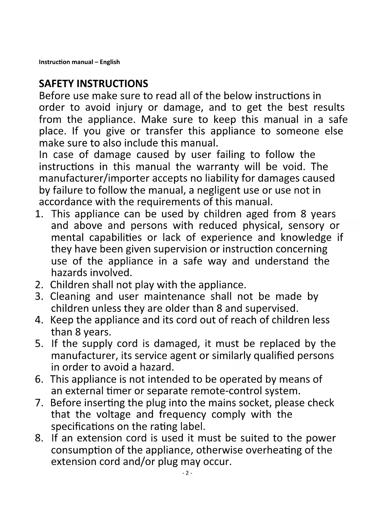 Instruction manual – English ..................................................................................... - 2 - Bedienungsanleitung – Deutsch ................................................................................ - 6 - Mode d‘emploi – Français ........................................................................................- 11 - Manuale d'istruzioni – Italiano .................................................................................- 16 -- 2 - Instruction manual – English SAFETY INSTRUCTIONS Before use make sure to read all of the below instructions in order to avoid injury or damage, and to get the best results from the appliance. Make sure to keep this manual in a safe place. If you give or transfer this appliance to someone else make sure to also include this manual. In case of damage caused by user failing to follow the instructions in this manual the warranty will be void. The manufacturer/importer accepts no liability for damages caused by failure to follow the manual, a negligent use or use not in accordance with the requirements of this manual.