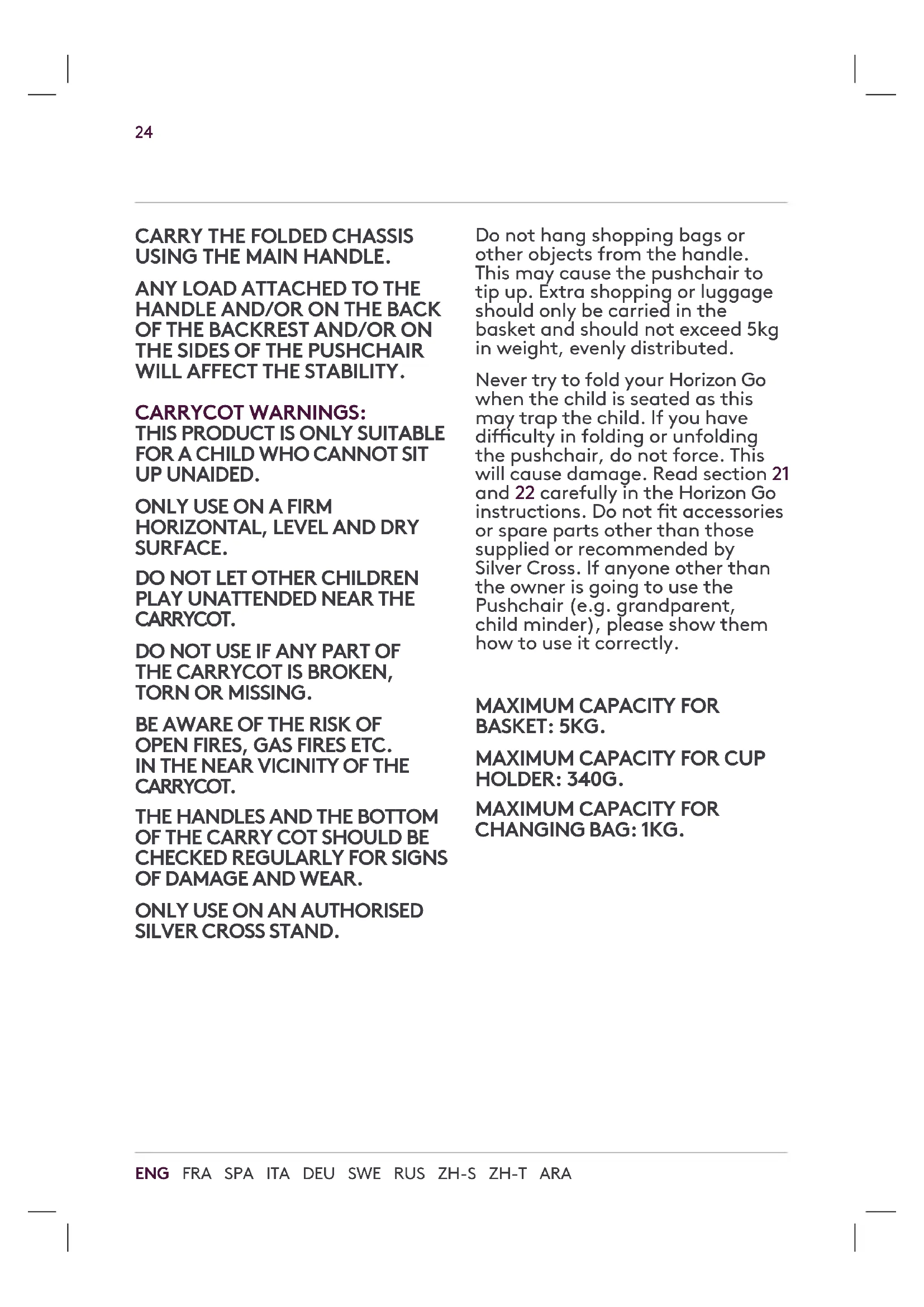 SILVER CROSS STAND. Do not hang shopping bags or other objects from the handle. This may cause the pushchair to tip up. Extra shopping or luggage should only be carried in the basket and should not exceed 5kg in weight, evenly distributed. Never try to fold your Horizon Go when the child is seated as this may trap the child. If you have diculty in folding or unfolding the pushchair, do not force. This will cause damage. Read section 21 and 22 carefully in the Horizon Go instructions. Do not t accessories or spare parts other than those supplied or recommended by Silver Cross. If anyone other than the owner is going to use the Pushchair (e.g. grandparent, child minder), please show them how to use it correctly.