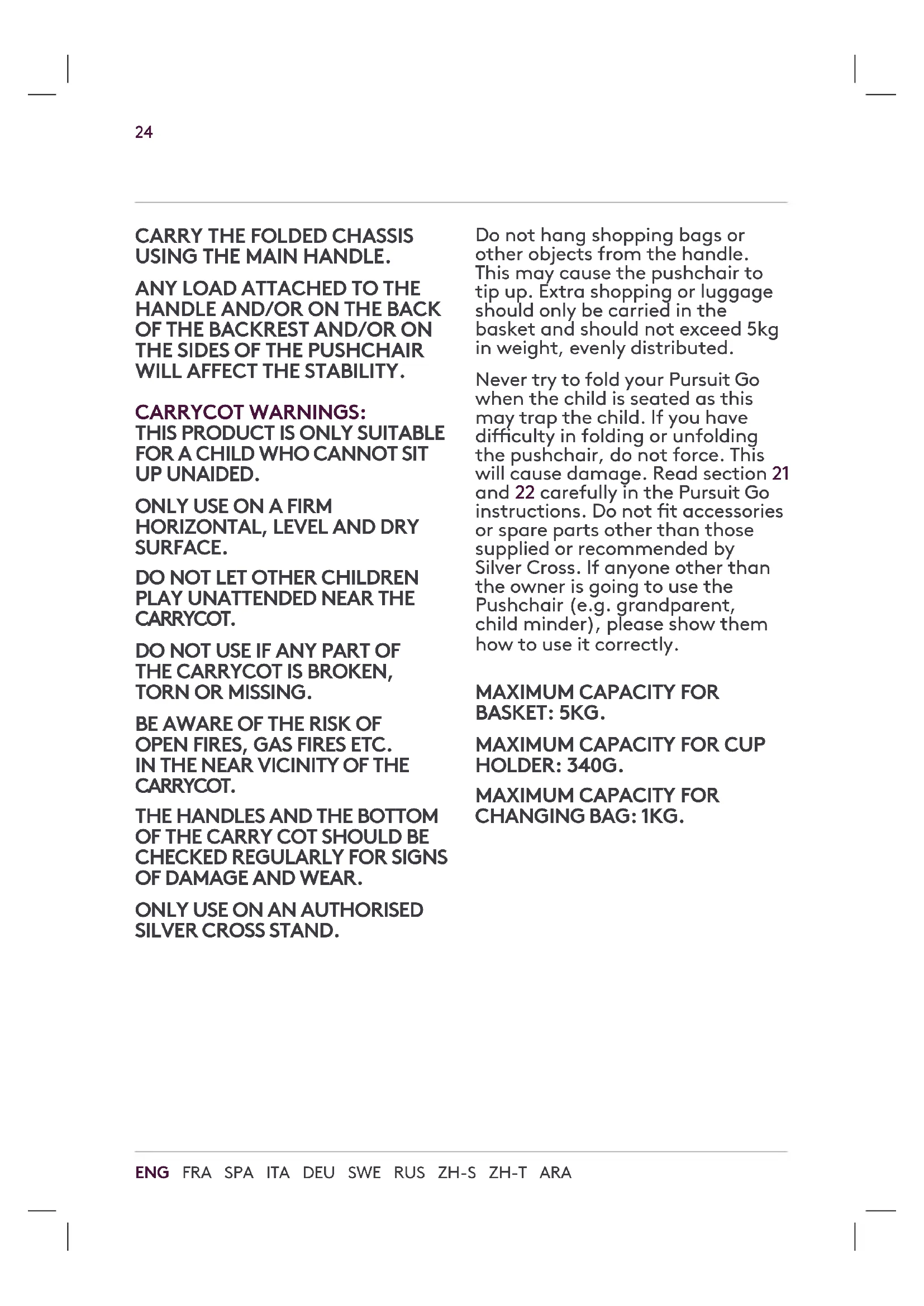 SILVER CROSS STAND. Do not hang shopping bags or other objects from the handle. This may cause the pushchair to tip up. Extra shopping or luggage should only be carried in the basket and should not exceed 5kg in weight, evenly distributed. Never try to fold your Pursuit Go when the child is seated as this may trap the child. If you have diculty in folding or unfolding the pushchair, do not force. This will cause damage. Read section 21 and 22 carefully in the Pursuit Go instructions. Do not t accessories or spare parts other than those supplied or recommended by Silver Cross. If anyone other than the owner is going to use the Pushchair (e.g. grandparent, child minder), please show them how to use it correctly.