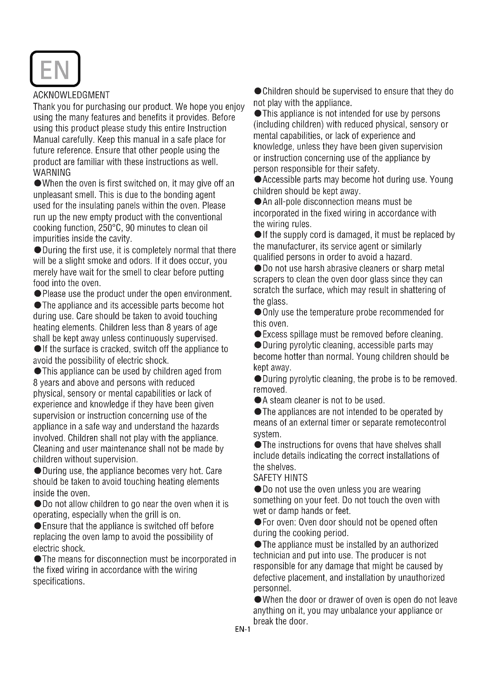 This appliance can be used by children aged from 8 years and above and persons with reduced physical, sensory or mental capabilities or lack of experience and knowledge if they have been given supervision or instruction concerning use of the appliance in a safe way and understand the hazards involved. Children shall not play with the appliance. Cleaning and user maintenance shall not be made by children without supervision. - During use, the appliance becomes very hot. Care should be taken to avoid touching heating elements inside the oven.