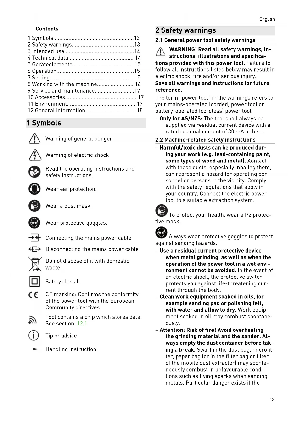 – Harmful/toxic dusts can be produced dur ing your work (e.g. lead-containing paint, some types of wood and metal). Aontact with these dusts, especially inhaling them, can represent a hazard for operating per sonnel or persons in the vicinity. Comply with the safety regulations that apply in your country. Connect the electric power tool to a suitable extraction system. To protect your health, wear a P2 protec tive mask. Always wear protective goggles to protect against sanding hazards. – Use a residual current protective device when metal grinding, as well as when the operation of the power tool in a wet envi ronment cannot be avoided. In the event of an electric shock, the protective switch protects you against life-threatening cur rent through the body. – Clean work equipment soaked in oils, for example sanding pad or polishing felt, with water and allow to dry. Work equip ment soaked in oil may combust spontane ously. – Attention: Risk of fire! Avoid overheating the grinding material and the sander. Al ways empty the dust container before tak ing a break. Swarf in the dust bag, microfil ter, paper bag (or in the filter bag or filter of the mobile dust extractor) may sponta neously combust in unfavourable condi tions such as flying sparks when sanding metals. Particular danger exists if the English 13swarf is mixed with paint, polyurethane residue or other chemical materials and the grinding material is hot after long peri ods of work. – Always use original Festool sanding pads. Foreign pads are not suitable for the speed of the sander and may break. – If the power tool is dropped or falls, check for damage to the machine and sanding pad. Remove the sanding pad for closer inspection. Repair damaged parts before using again. Broken sanding pads and damaged machines can cause injuries and machine instability.