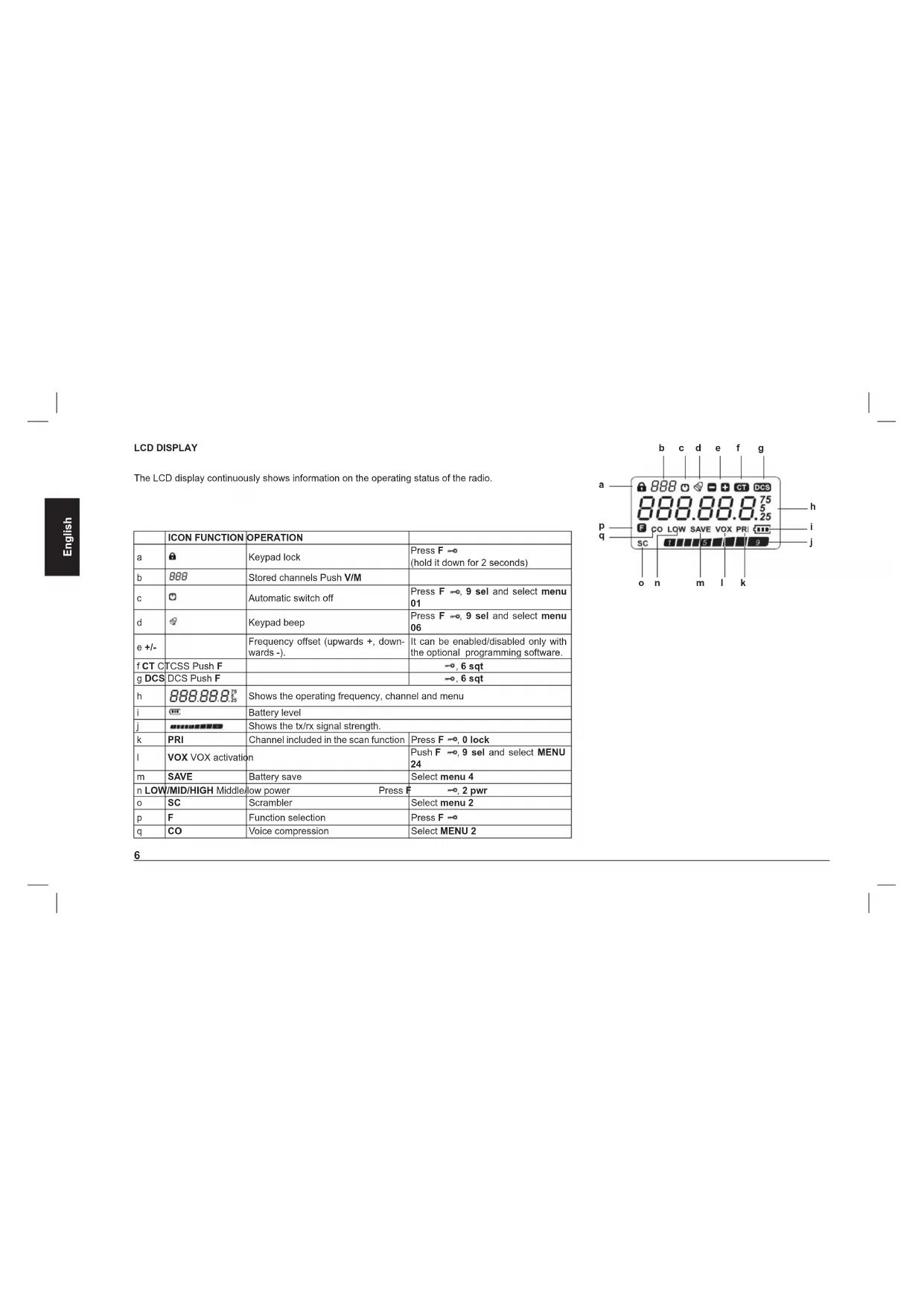 Shows the tx/rx signal strength. k PRI Channel included in the scan function Press F , 0 lock l VOX VOX activation Push F , 9 sel and select MENU