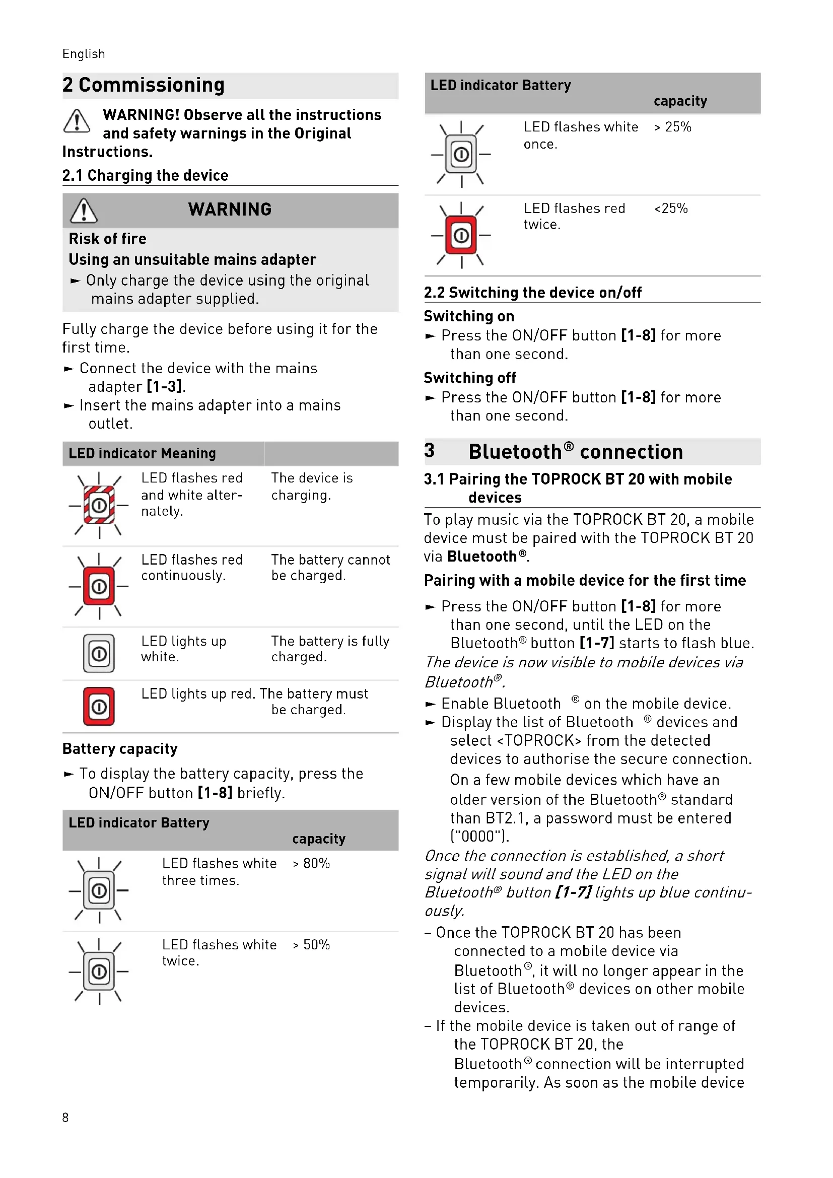 The LED on the Bluetooth® button [1-7] starts to flash blue to signal that the TOPROCK BT 20 is ready to be reconnected.