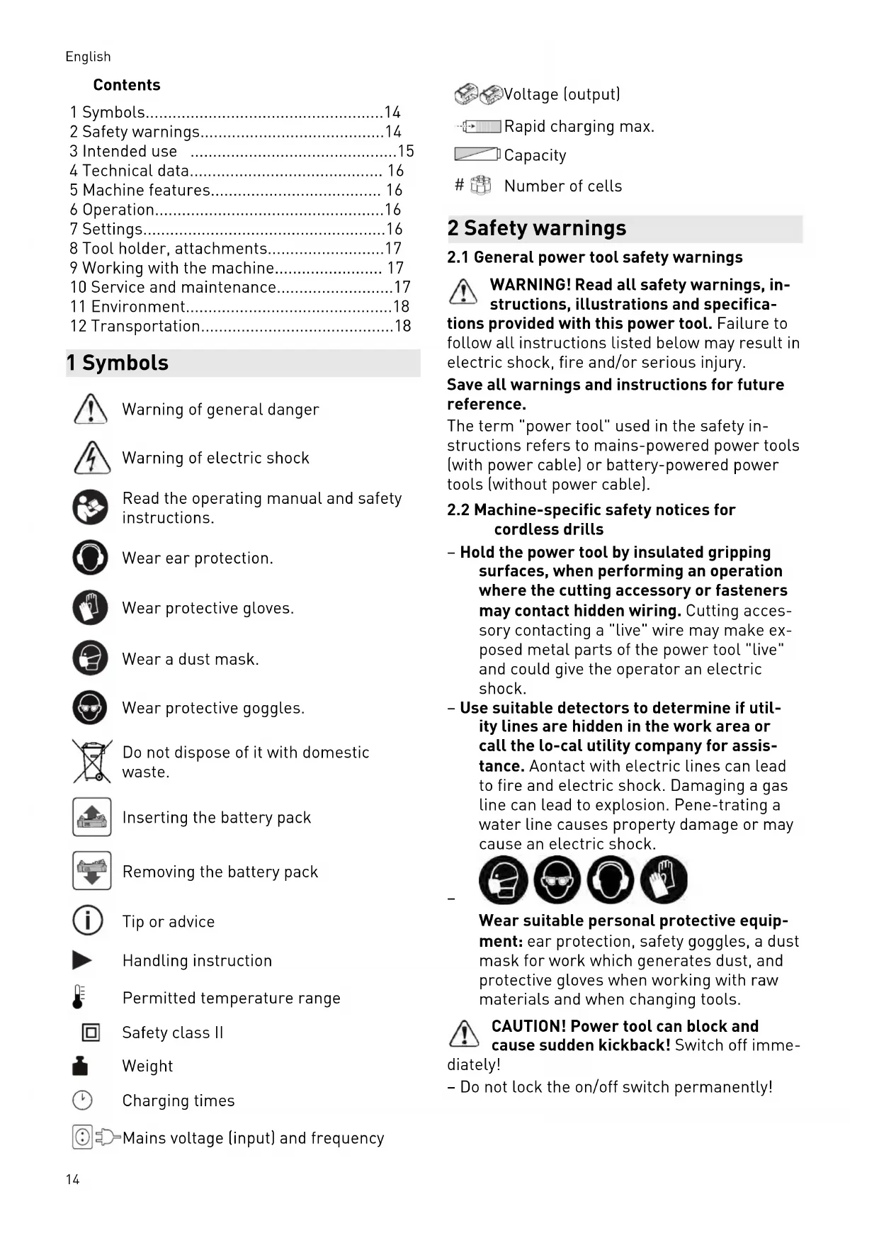 Wear suitable personal protective equip ment: ear protection, safety goggles, a dust mask for work which generates dust, and protective gloves when working with raw materials and when changing tools. CAUTION! Power tool can block and cause sudden kickback! Switch off imme diately! – Do not lock the on/off switch permanently! English 14Safety instructions when using long drill bits – a) Never operate at higher speed than the maximum speed rating of the drill bit.