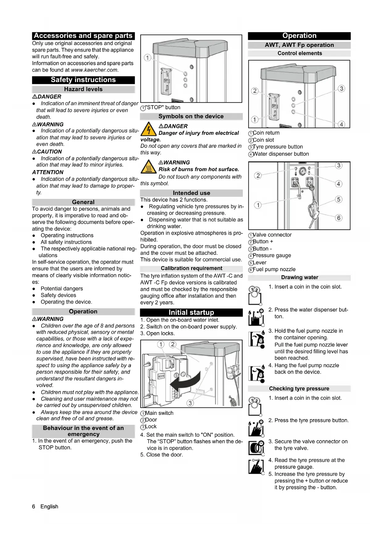 STOP button. 1 "STOP" button Symbols on the device DANGER Danger of injury from electrical voltage. Do not open any covers that are marked in this way. 몇WARNING Risk of burns from hot surface. Do not touch any components with this symbol. Intended use This device has 2 functions. ● Regulating vehicle tyre pressures by in- creasing or decreasing pressure. ● Dispensing water that is not suitable as drinking water. Operation in explosive atmospheres is pro- hibited. During operation, the door must be closed and the cover must be attached. This device is suitable for commercial use. Calibration requirement The tyre inflation system of the AWT -C and AWT -C Fp device versions is calibrated and must be checked by the responsible gauging office after installation and then every 2 years. Initial startup