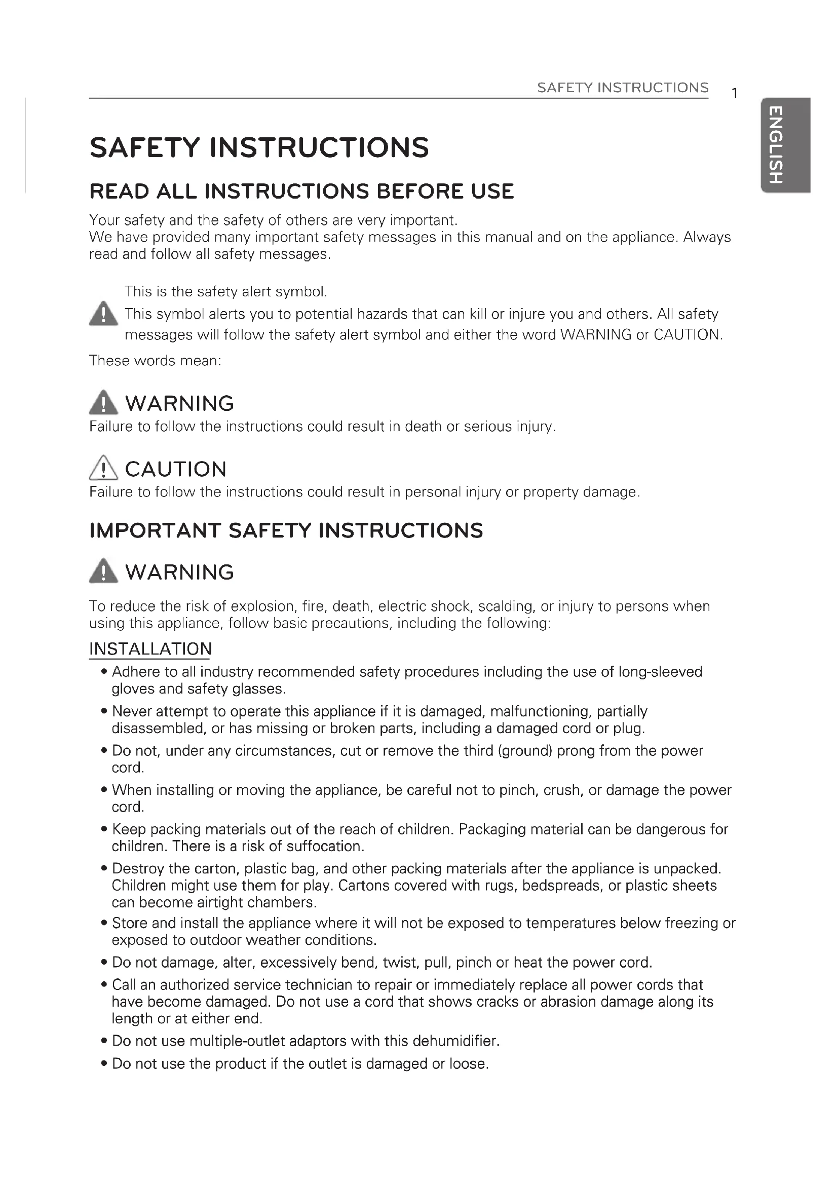 This is the safety alert symbol. This symbol alerts you to potential hazards that can kill or injure you and others. All safety messages will follow the safety alert symbol and either the word WARNING or CAUTION.2 SAFETY INSTRUCTIONS ENGLISH