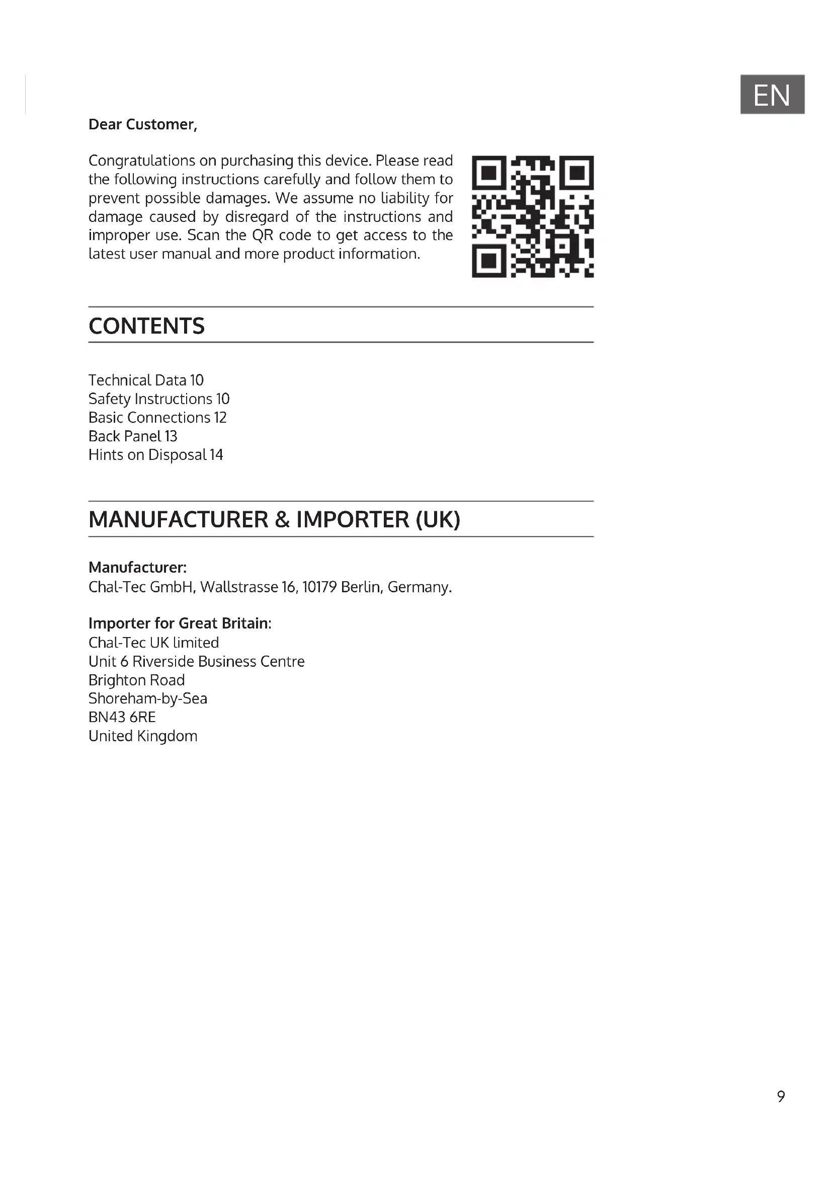 Dear Customer, Congratulations on purchasing this device. Please read the following instructions carefully and follow them to prevent possible damages. We assume no liability for damage caused by disregard of the instructions and improper use. Scan the QR code to get access to the latest user manual and more product information. CONTENTS MANUFACTURER & IMPORTER (UK) Manufacturer: Chal-Tec GmbH, Wallstrasse 16, 10179 Berlin, Germany. Importer for Great Britain: Chal-Tec UK limited Unit 6 Riverside Business Centre Brighton Road Shoreham-by-Sea BN43 6RE United Kingdom Technical Data 10 Safety Instructions 10 Basic Connections 12 Back Panel 13 Hints on Disposal 1410